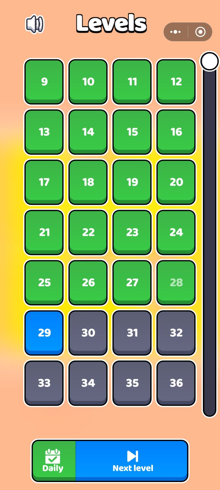 2000的关卡滑到底部的时候都惊呆了,本来过了20多关以为玩的挺深入的,结果连10%都没有玩到,关卡数量上让人无法说出一句不耐玩,就是关卡玩法重复度比较高,玩到快30关了,基本没有出现其他道具,只有地形的变化,虽然耐玩,但同一个玩法长时间玩下去可能会比较枯燥,适合闲暇用来打发时间,不适合专攻。