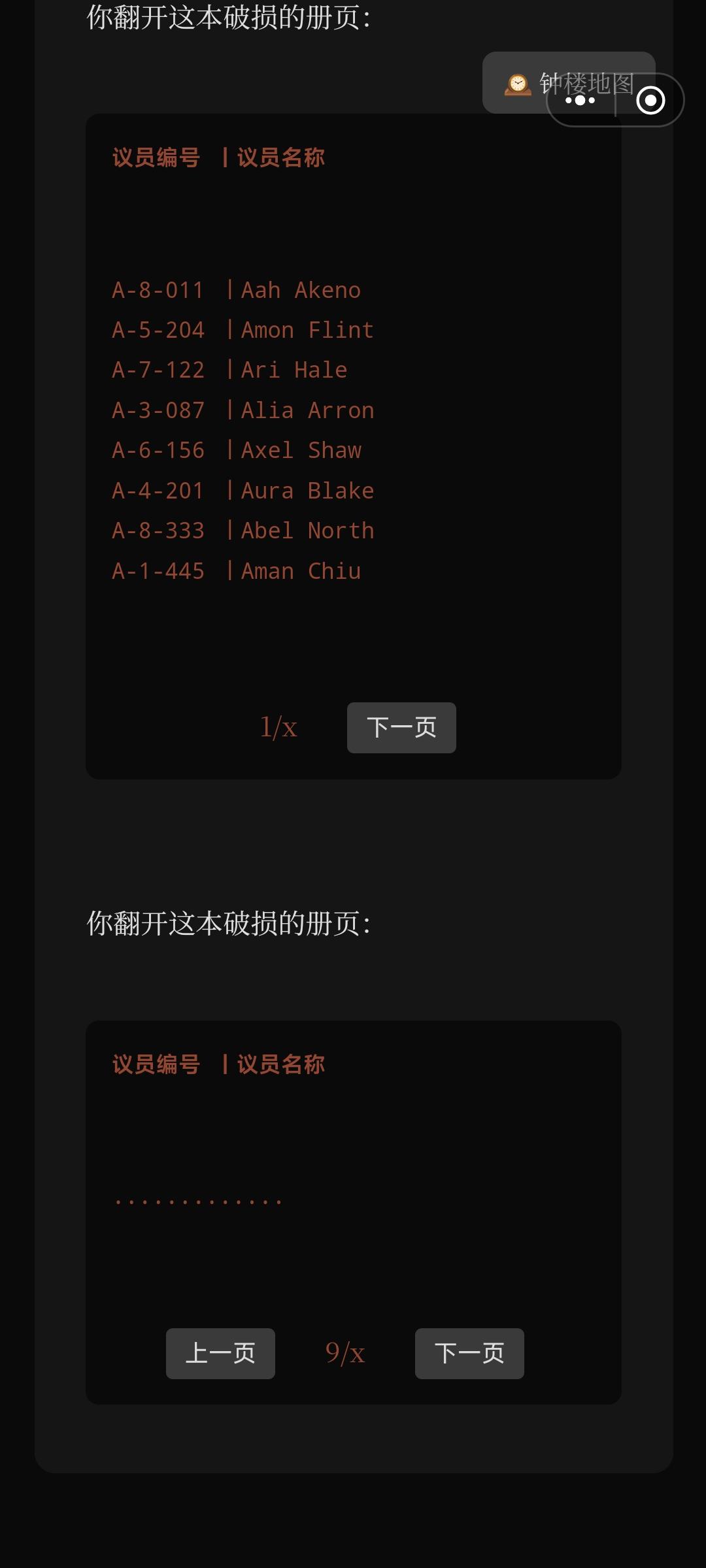 进入钟楼内部,查看分针下方有D议员的账本,由前方议员的名单知道D议员的编号为D-3-055,输入3055即可开启账本