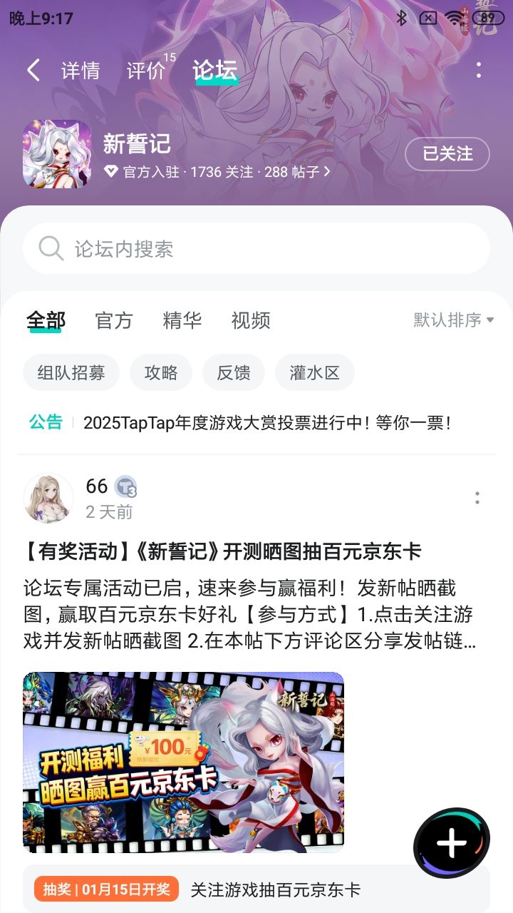 论坛专属活动已启,速来参与赢福利!预约游戏发新帖晒截图,赢百元京东卡!迎战神秘势力,拯救山海八荒!!!【参与方式】1.点击关注预约《新誓记》并发新帖晒截图2.在本帖下方评论区分享发帖链接即可【活动时间】即日起至1月5日【活动奖励】随机抽取1名符合参与条件的玩家获得:100元京东卡一张【活动规则】1.内容禁止涉及暴力、色情、政治、恐怖内容,违者做删帖处理并取消活动资格;2.回