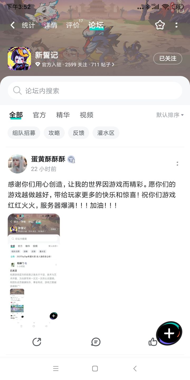 论坛专属活动已启,速来参与赢福利!发新帖晒截图,赢取京东卡好礼【参与方式】1.点击关注游戏并发新帖晒截图2.在本帖下方评论区分享发帖链接即可【活动时间】即日起至1月17日【活动奖励】随机抽取1名符合参与条件的玩家获得:50元京东卡一张【活动规则】1.内容禁止涉及暴力、色情、政治、恐怖内容,违者做删帖处理并取消活动资格;2.回复内容需与活动主题相关,若抽中楼层与主题无关则将取消