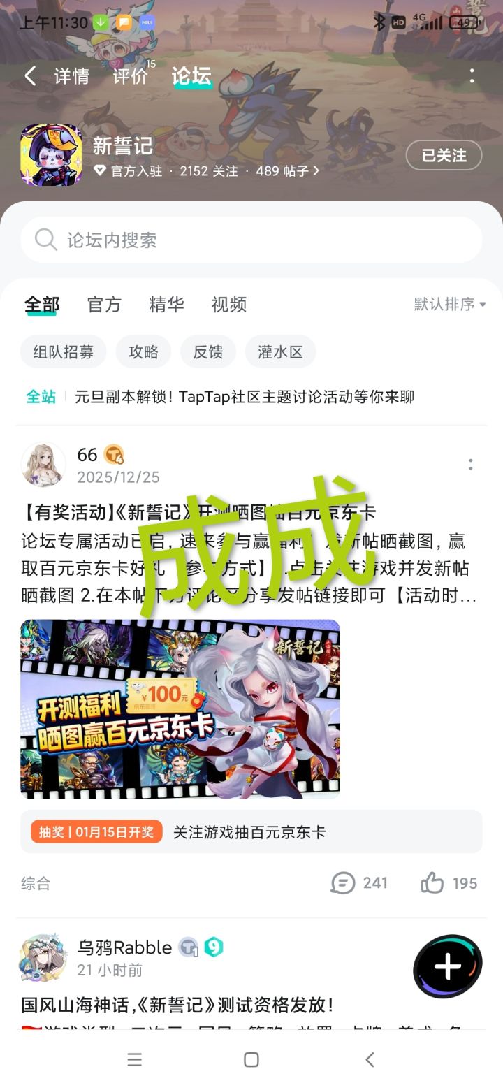 论坛专属活动已启,速来参与赢福利!预约游戏发新帖晒截图,赢百元京东卡!迎战神秘势力,拯救山海八荒!!!【参与方式】1.点击关注预约《新誓记》并发新帖晒截图2.在本帖下方评论区分享发帖链接即可【活动时间】即日起至1月5日【活动奖励】随机抽取1名符合参与条件的玩家获得:100元京东卡一张【活动规则】1.内容禁止涉及暴力、色情、政治、恐怖内容,违者做删帖处理并取消活动资格;2.回
