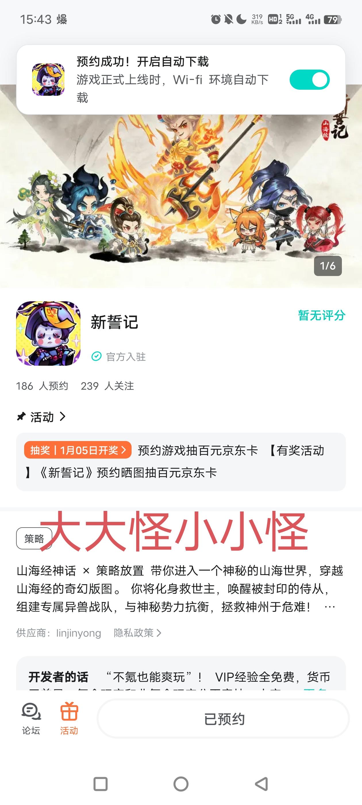 论坛专属活动已启,速来参与赢福利!预约游戏发新帖晒截图,赢百元京东卡!迎战神秘势力,拯救山海八荒!!!【参与方式】1.点击关注预约《新誓记》并发新帖晒截图2.在本帖下方评论区分享发帖链接即可【活动时间】即日起至1月5日【活动奖励】随机抽取1名符合参与条件的玩家获得:100元京东卡一张【活动规则】1.内容禁止涉及暴力、色情、政治、恐怖内容,违者做删帖处理并取消活动资格;2.回