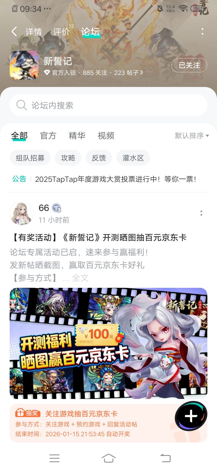 论坛专属活动已启,速来参与赢福利!预约游戏发新帖晒截图,赢百元京东卡!迎战神秘势力,拯救山海八荒!!!【参与方式】1.点击关注预约《新誓记》并发新帖晒截图2.在本帖下方评论区分享发帖链接即可【活动时间】即日起至1月5日【活动奖励】随机抽取1名符合参与条件的玩家获得:100元京东卡一张【活动规则】1.内容禁止涉及暴力、色情、政治、恐怖内容,违者做删帖处理并取消活动资格;2.回