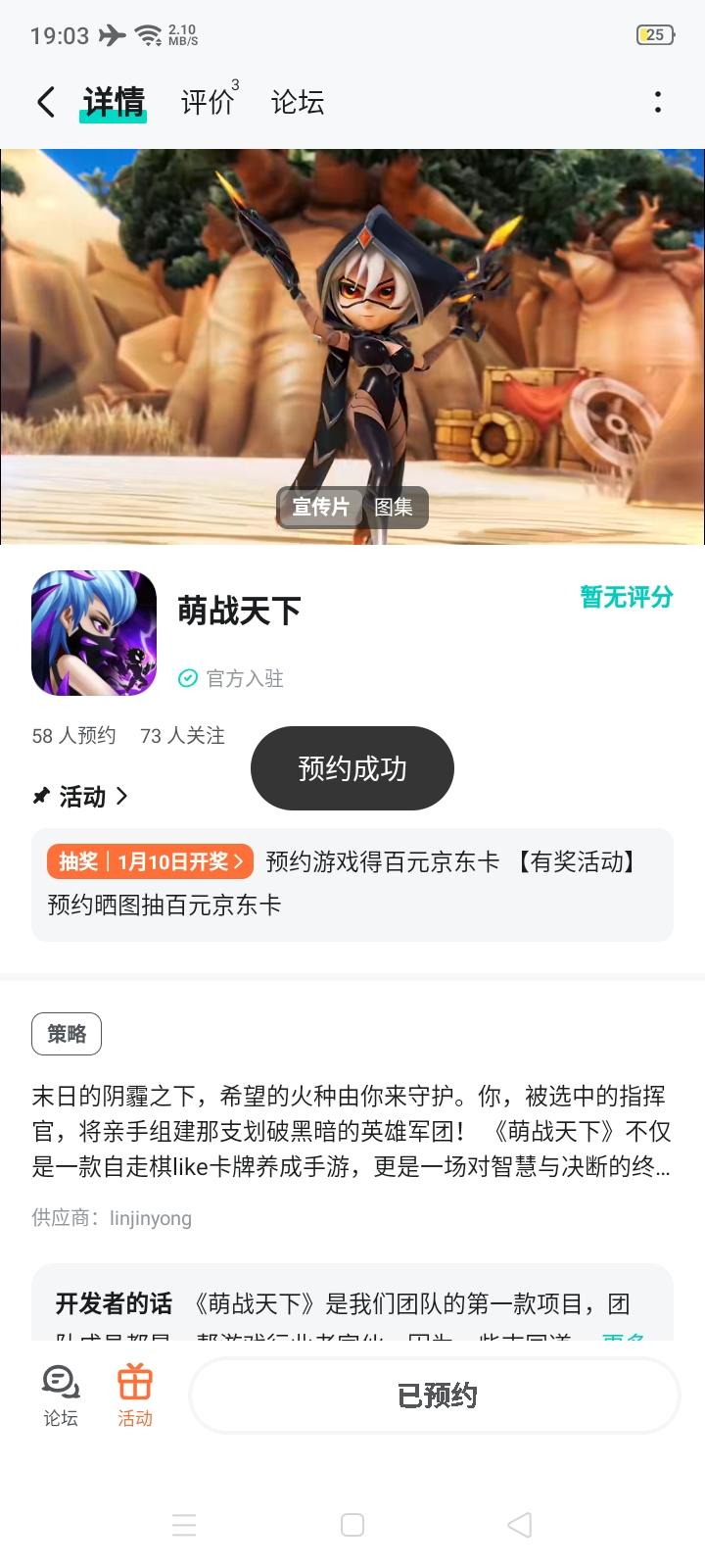 论坛专属活动已启,速来参与赢福利!预约游戏发新帖晒截图,赢百元京东卡!【参与方式】1.点击关注预约游戏并发新帖晒截图2.在本帖下方评论区分享发帖链接即可【活动时间】即日起至1月10日【活动奖励】随机抽取1名符合参与条件的玩家获得:100元京东卡一张【活动规则】1.内容禁止涉及暴力、色情、政治、恐怖内容,违者做删帖处理并取消活动资格;2.回复内容需与活动主题相关,若抽中楼层与主