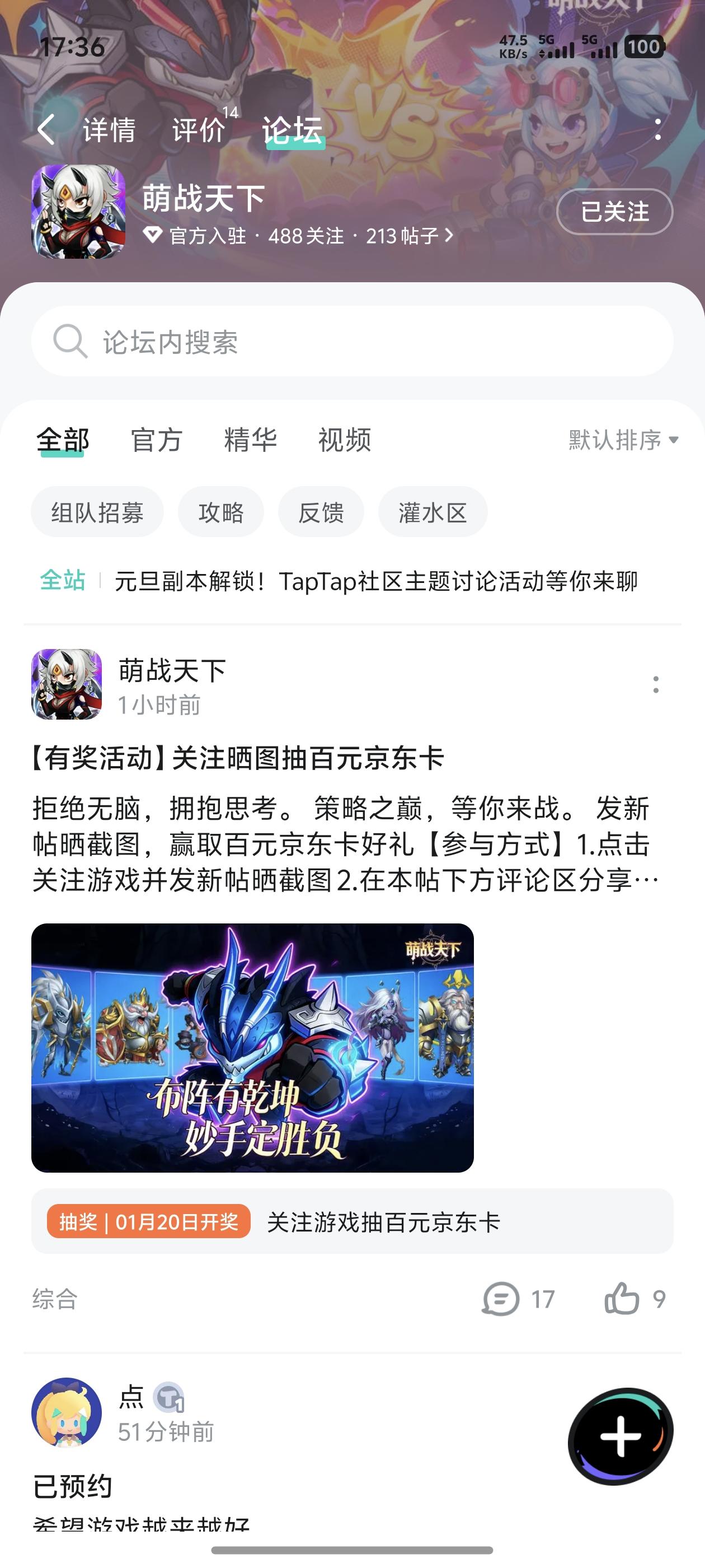 论坛专属活动已启,速来参与赢福利!预约游戏发新帖晒截图,赢百元京东卡!【参与方式】1.点击关注预约游戏并发新帖晒截图2.在本帖下方评论区分享发帖链接即可【活动时间】即日起至1月10日【活动奖励】随机抽取1名符合参与条件的玩家获得:100元京东卡一张【活动规则】1.内容禁止涉及暴力、色情、政治、恐怖内容,违者做删帖处理并取消活动资格;2.回复内容需与活动主题相关,若抽中楼层与主