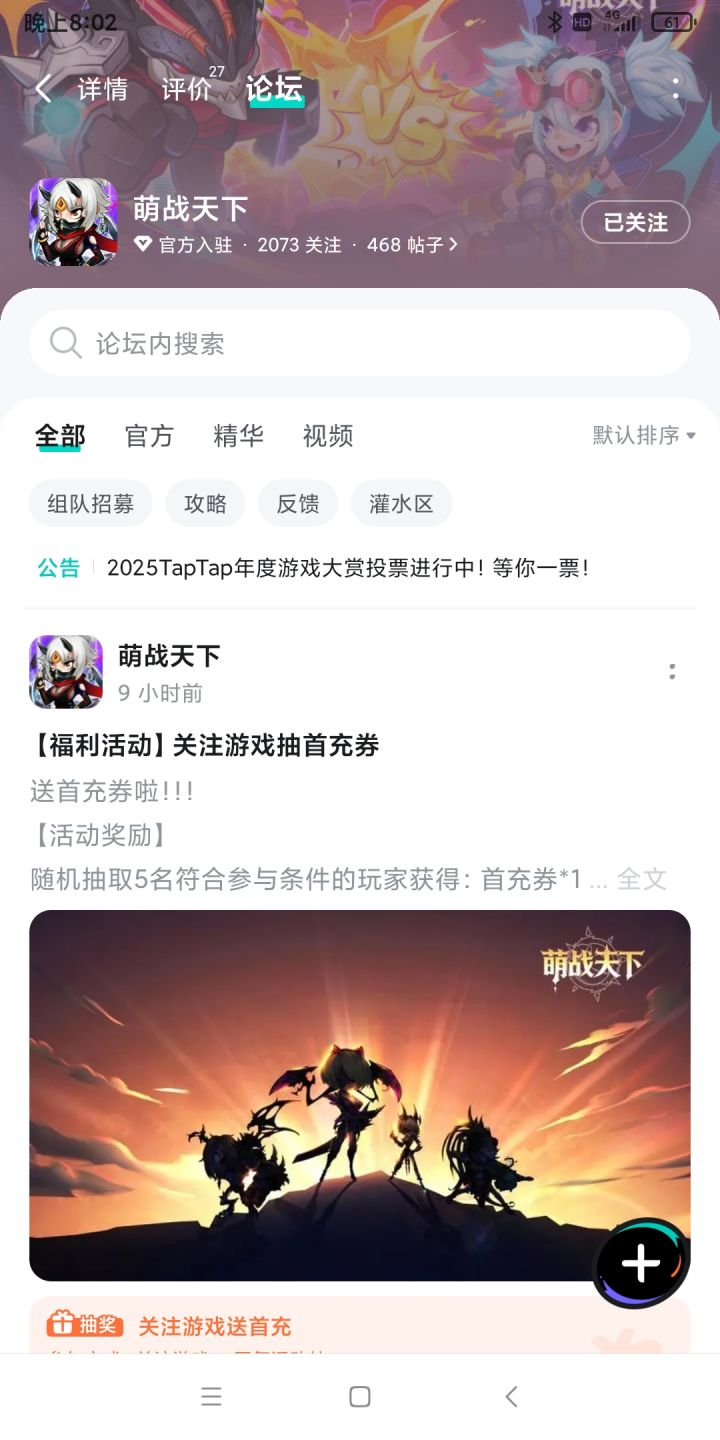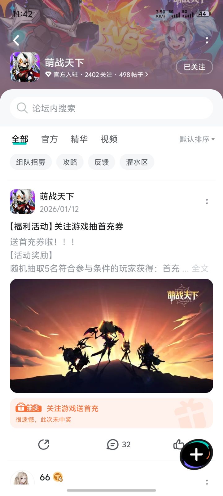 送首充券啦!!!【活动奖励】随机抽取5名符合参与条件的玩家获得:首充券*1【参与方式】点击关注游戏测试并回复本帖即可【活动时间】即日起至1月14日【活动规则】1.内容禁止涉及暴力、色情、政治、恐怖内容,违者做删帖处理并取消活动资格;2.回复内容需与活动主题相关,若抽中楼层与主题无关则将取消领奖资格;3.请勿盗用他人回复内容,否则取消抽奖资格;4.每个IP仅有一次中奖机会,严禁