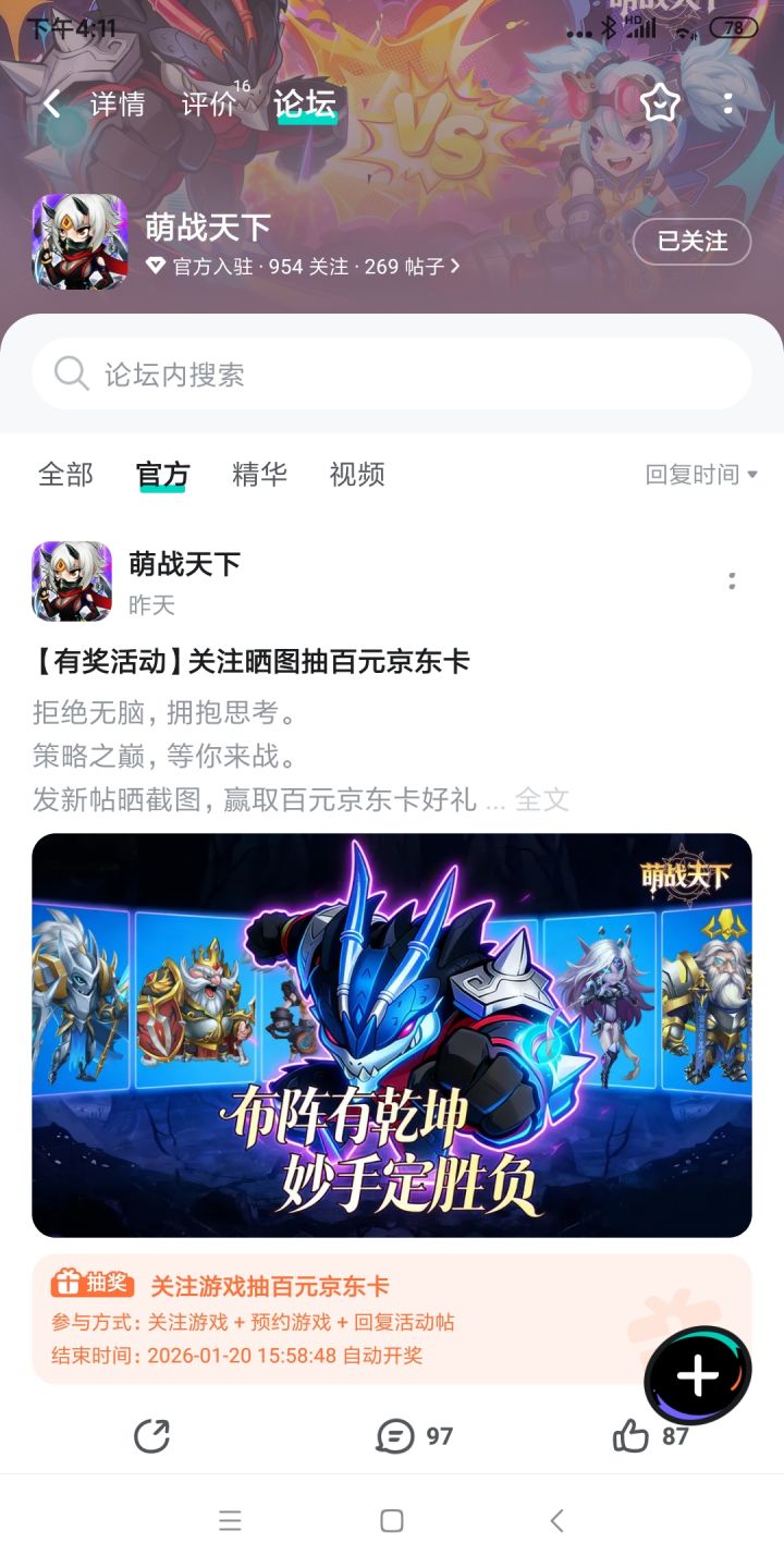 论坛专属活动已启,速来参与赢福利!预约游戏发新帖晒截图,赢百元京东卡!【参与方式】1.点击关注预约游戏并发新帖晒截图2.在本帖下方评论区分享发帖链接即可【活动时间】即日起至1月10日【活动奖励】随机抽取1名符合参与条件的玩家获得:100元京东卡一张【活动规则】1.内容禁止涉及暴力、色情、政治、恐怖内容,违者做删帖处理并取消活动资格;2.回复内容需与活动主题相关,若抽中楼层与主