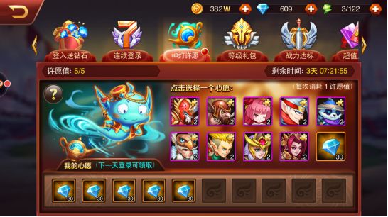 关于许愿。在有盾用的情况下,星彩是必须许愿的,可以7天许愿星彩。奶是推图必须!!!! 如果没有盾,可以前2天许愿甘宁,然后商城所有积分都换甘宁碎片,第三天就可以拥有不错的盾了。这游戏主要看盾抗不抗的住!甘宁出来后,剩下的都许愿星彩。 7天战力达标活动,大家提升战力达到170000,可获得10张钻石抽奖卷。第七天登陆送英雄(根据自身拥有的英雄选择,缺什么选什么) 徐晃:在没有给力的盾的情