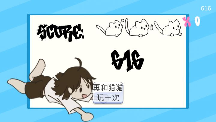 2D卡通画风,界面结构非常简单,连UI都没多少。猫猫形象非常可爱讨喜,动作挺丰富,多只小坏蛋一只在扒拉东西,各种摆件从上方掉落,看起来既混乱又热闹。动态效果意思表达比较准确,接住的动作有些夸张,不过效果挺好。