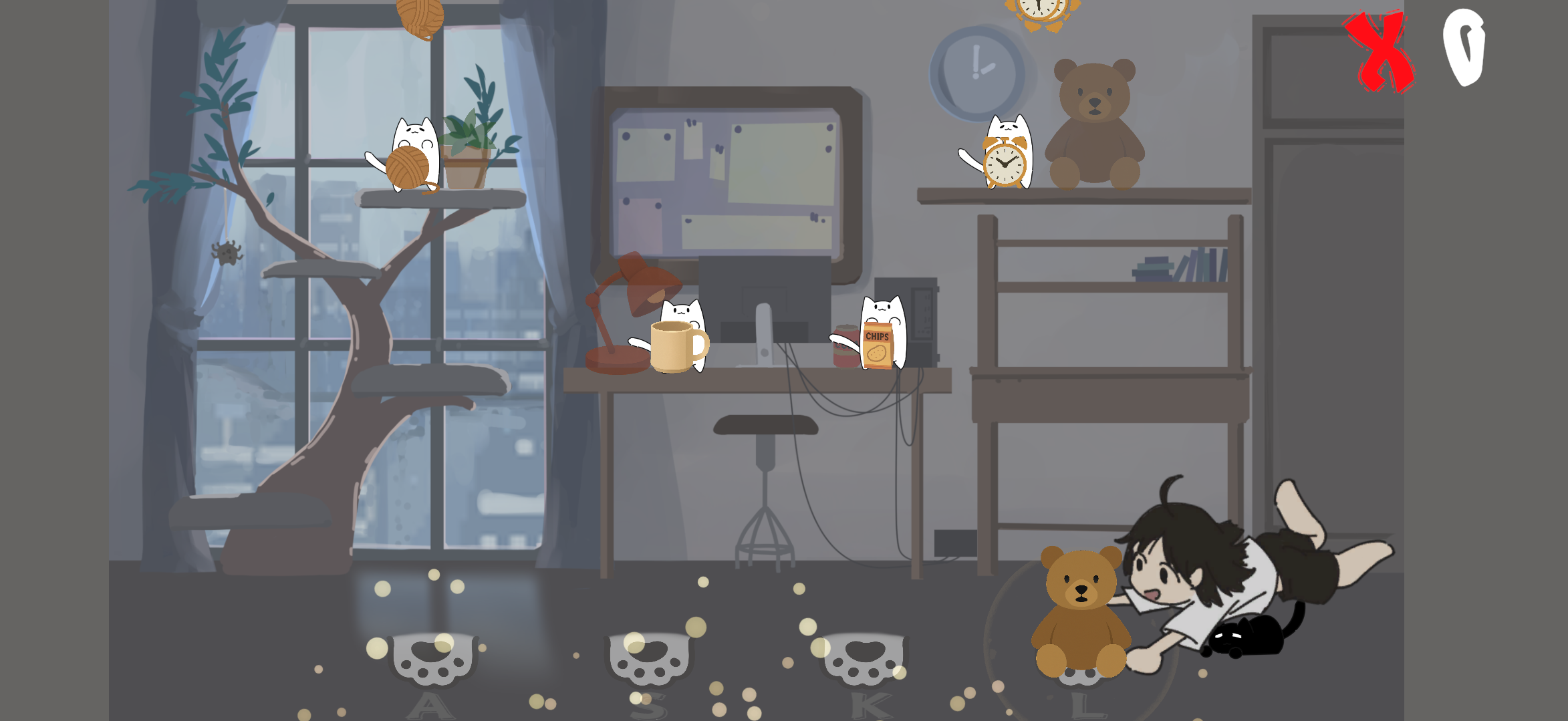有一小段的前情提要,就是说小猫会捣蛋,把桌上和猫爬架,反正你能看到的所有的它摆好的物品推倒,你的任务就是接住这些物品。