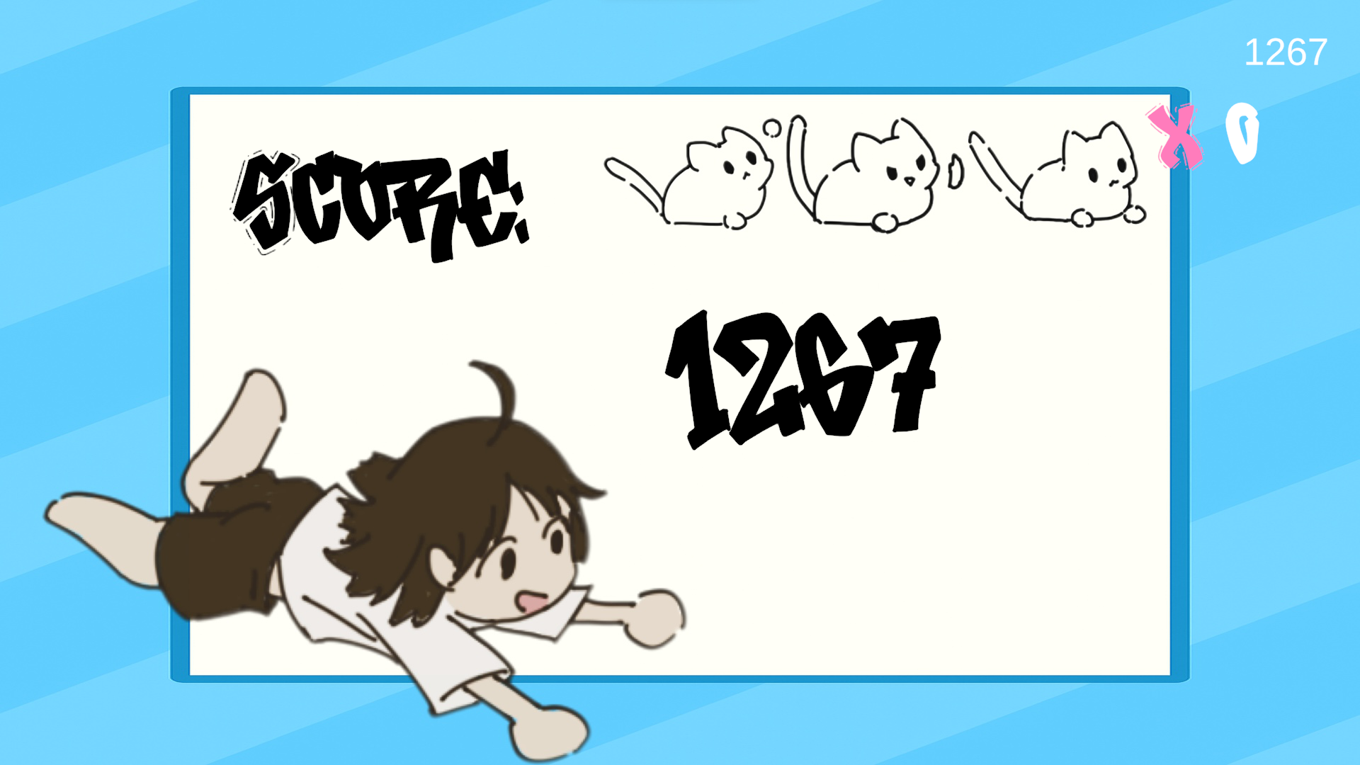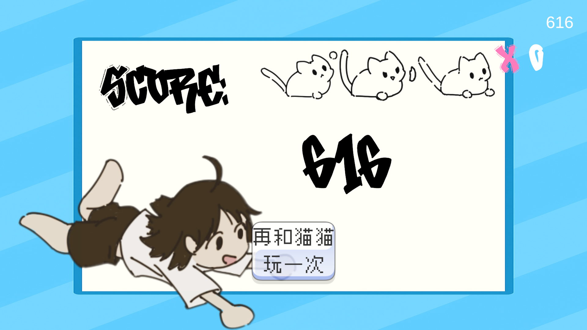降低物品下落的频率,将物品下落的规律与音乐鼓点节奏结合,增加跳过开头动画,为接住物品和没接住物品增加合适且符合音乐的音效。为猫猫增加更多样式,捣蛋的猫猫增加更多形态的动画。