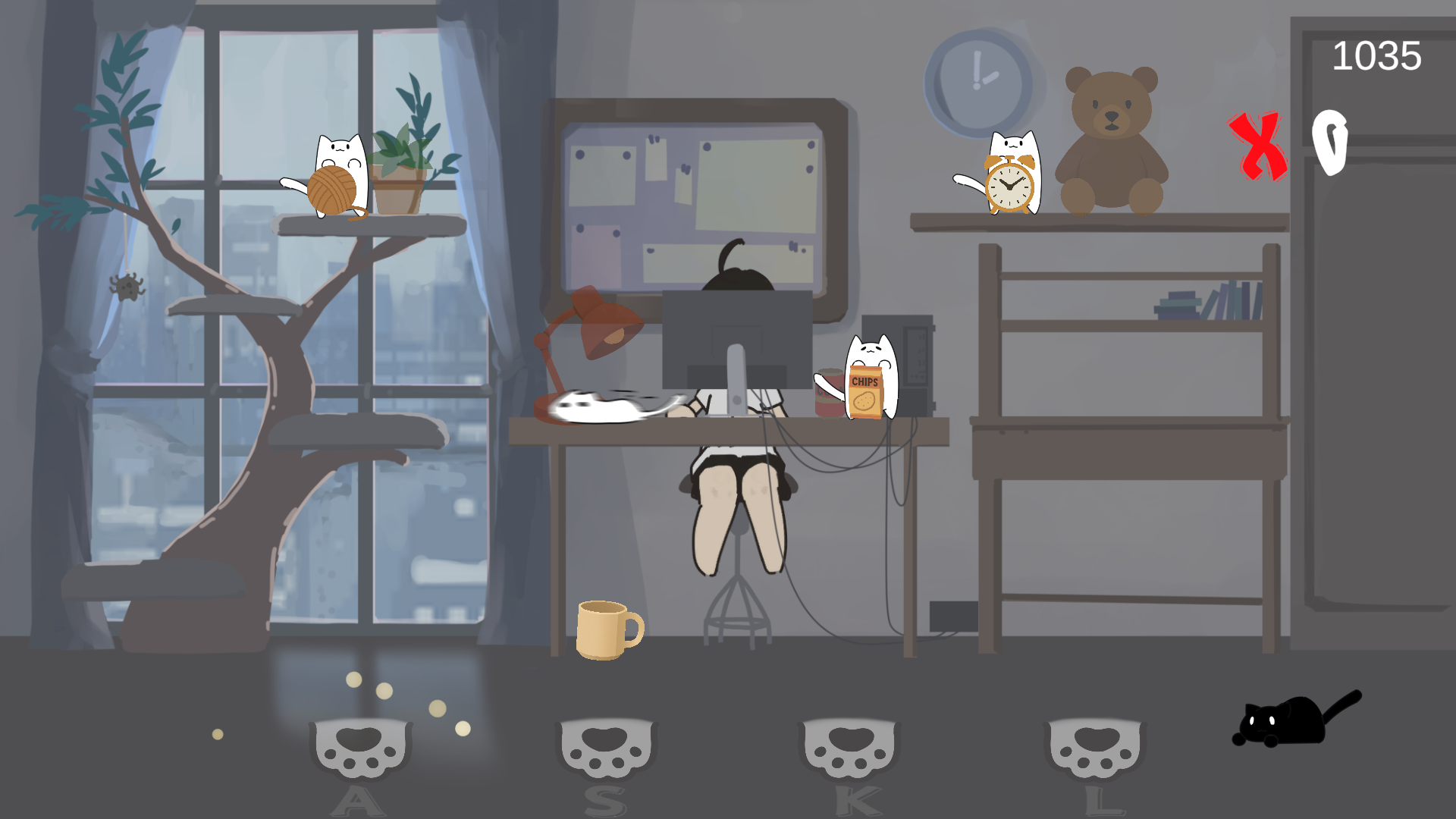 游戏是一款接住小猫弄掉的物品为主题的音游,玩家需要在物品掉落到地面之前的那一刻接住物品,游戏中没有有关bug内容的出现,故不符合参赛作品的要求,但就游戏本身内容而言还是挺有想法的。