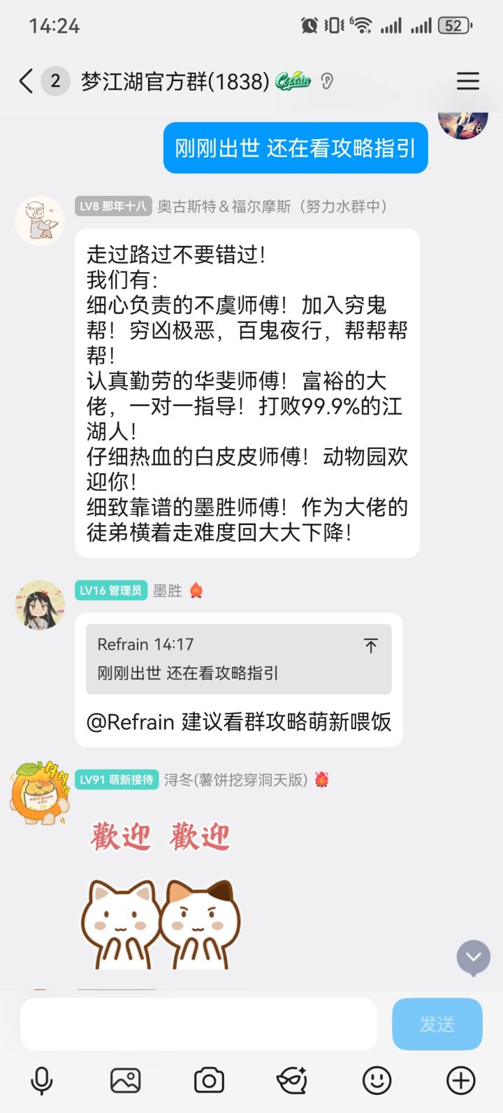 有很多大佬会很认真的教我们这些萌新,游戏也有挺多白嫖活动,玩法多样,不群里的玩家都很热情,而且有创新至高等方面的武学,经验增长的相对来说也比较快。也有比赛之类的竞技活动。总之非常好