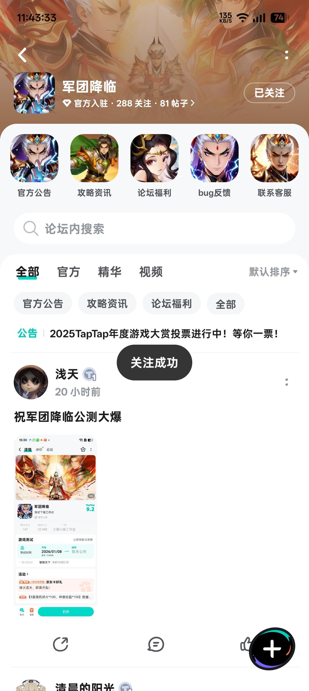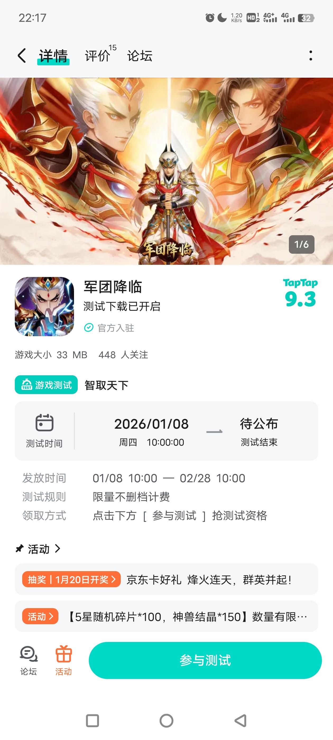 战火纷飞的三国乱世,正等待一位真正的统帅降临。《军团降临》邀你收集两百余名传奇武将,运筹帷幄、决胜千里!黑夜突袭、火攻连营、军团争霸…… 真实战场,由你掌控!为感谢各位主公的支持,我们准备了一份小福利!【活动内容】关注官方账号关注游戏,并在本帖留言,即可参与抽奖!【活动奖励】抽 1 位幸运主公送出10 元京东卡 ×1【参与方式】【开奖方式】活动结束后,由 TapTap 系统随机
