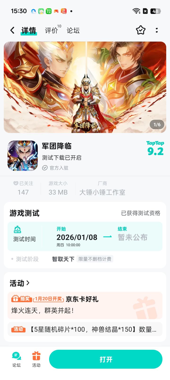 烽火连天,群英并起!年度策略卡牌《军团降临》正式开服!诚邀您执掌天命,招募名将,运筹帷幄,在这风云变幻的乱世中,书写属于自己的传奇史诗!🎁 开测专属福利:【京东卡抽奖活动】▶ 参与方式1.点击关注发帖账号和《军团降临》且发新帖晒截图2.在本帖下方评论区分享发帖链接即可【奖品发放】到达开奖时间后,由taptap系统随机抽取符合要求的幸运玩家,自动发放兑换码(对于同一账号大量故意发布评论刷