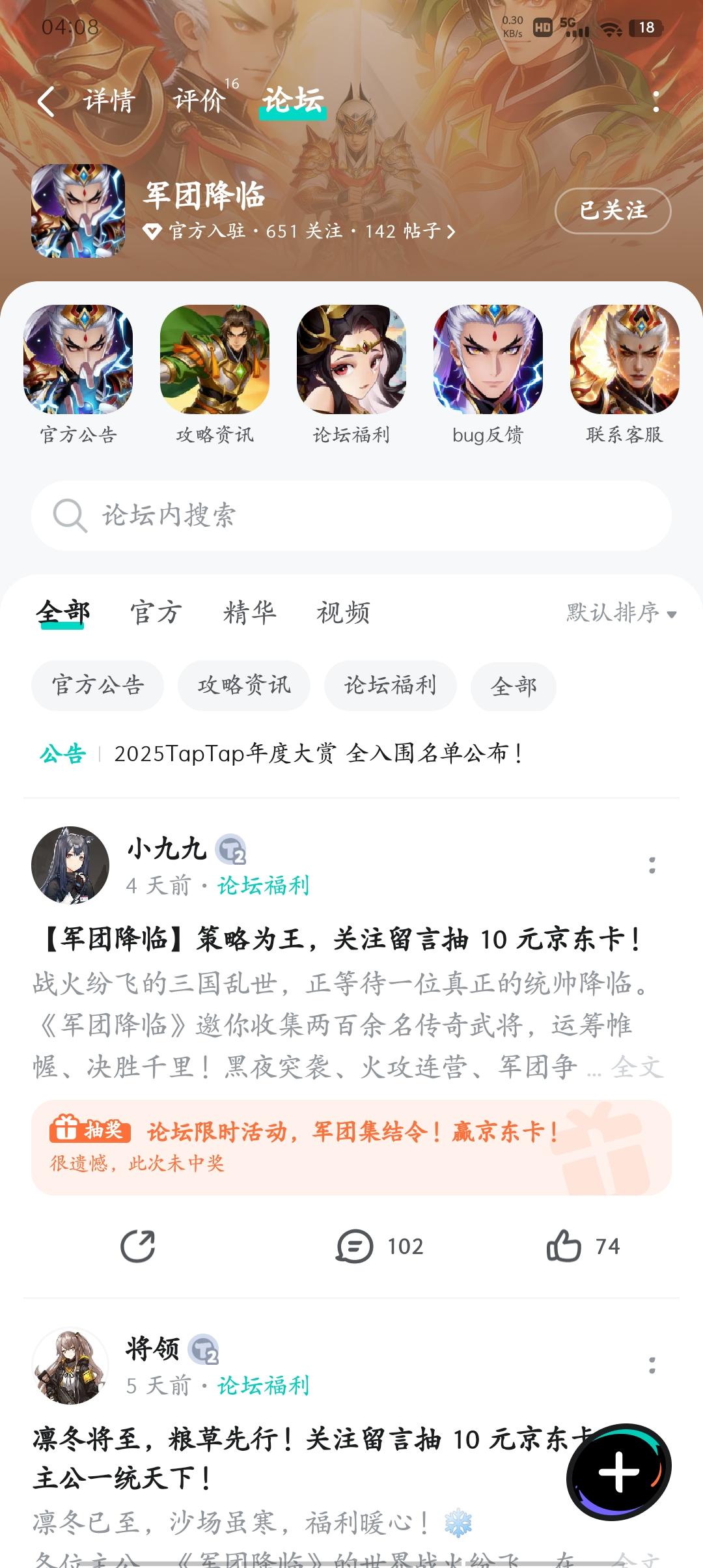 战火纷飞的三国乱世,正等待一位真正的统帅降临。《军团降临》邀你收集两百余名传奇武将,运筹帷幄、决胜千里!黑夜突袭、火攻连营、军团争霸…… 真实战场,由你掌控!为感谢各位主公的支持,我们准备了一份小福利!【活动内容】关注官方账号关注游戏,并在本帖留言,即可参与抽奖!【活动奖励】抽 1 位幸运主公送出10 元京东卡 ×1【参与方式】【开奖方式】活动结束后,由 TapTap 系统随机