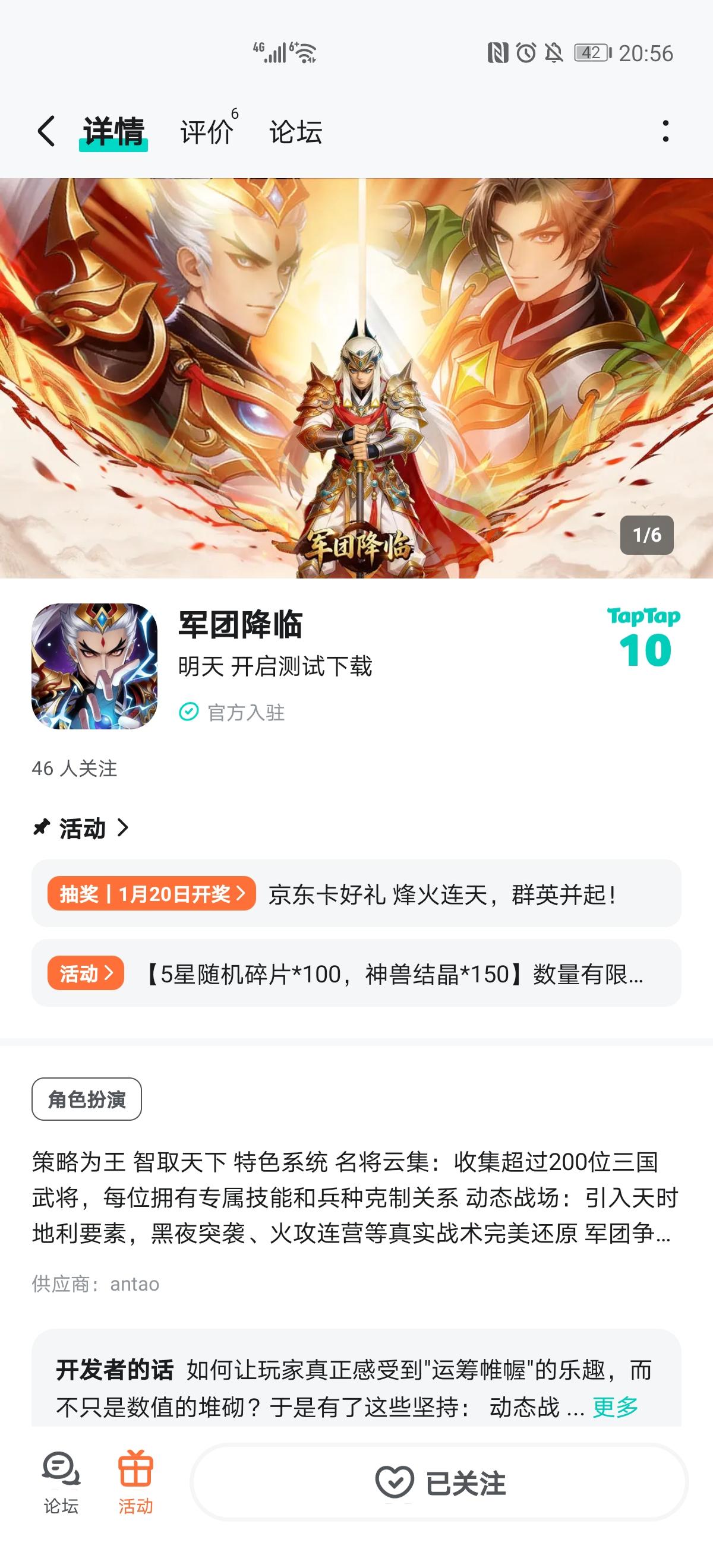 战火纷飞的三国乱世,正等待一位真正的统帅降临。《军团降临》邀你收集两百余名传奇武将,运筹帷幄、决胜千里!黑夜突袭、火攻连营、军团争霸…… 真实战场,由你掌控!为感谢各位主公的支持,我们准备了一份小福利!【活动内容】关注官方账号关注游戏,并在本帖留言,即可参与抽奖!【活动奖励】抽 1 位幸运主公送出10 元京东卡 ×1【参与方式】【开奖方式】活动结束后,由 TapTap 系统随机