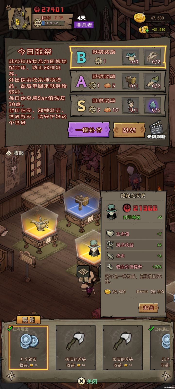就一页仓库,能展示11个藏品,每过一天随机污染藏品,属性失效没办法恢复。墙上的6个不知道放什么的,3张地图很简单,没多少可玩性