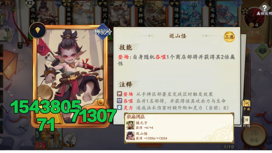 狮驼岭阵容主要玩法,是通过不断触发商店部将属性加成,让指定部将吞噬商店部将,将属性堆高。在所有势力里,狮驼岭成型后的部将属性上限最高! 前期推荐:小钻风、白象精、小喇叭。小钻风鼓励触发商店攻击+1,神通狂热能让他触发频率翻倍。小喇叭养白象精。白象精能一直用到决赛。 中期推荐:白面熊彪、地藏王菩萨、寿星。白面熊彪残念触发商店生命+2,地藏王菩萨放它右边,能开局多触发一次,配合寿星,残念触发次数翻倍。