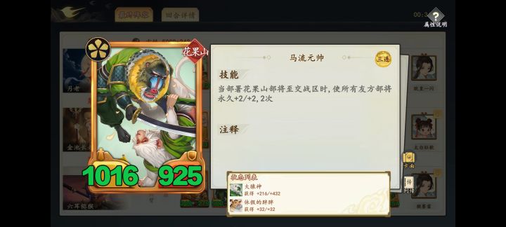 玩花果山感觉主要核心就三个:美猴王,大猿神,马流元帅。大猿神和马流元帅金了后可以多上一个。然后上个唐三藏和地藏王作为理财和花果山随从来源,有时候部件不齐可以上个胖胖做下位替代。阵容思路就是上阵花果山随从触发马流元帅加buff,然后马流触发美猴王和大猿神。而唐三藏做随从来源,有地藏的话选个地藏触发,不然有时候唐三藏太大了被对面打不死容易断节奏。阵容感觉玩着还行,主要是在拿到手后数值成长快,尽