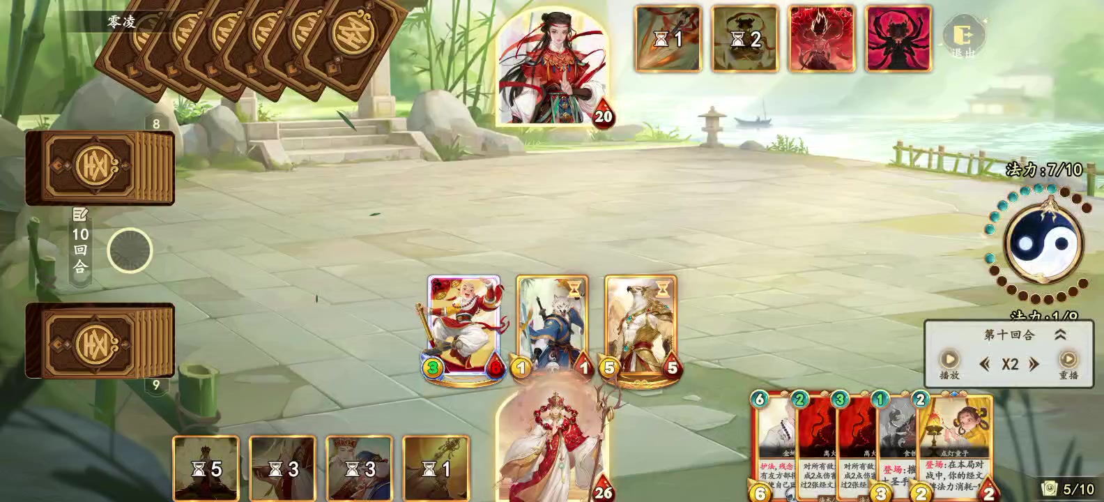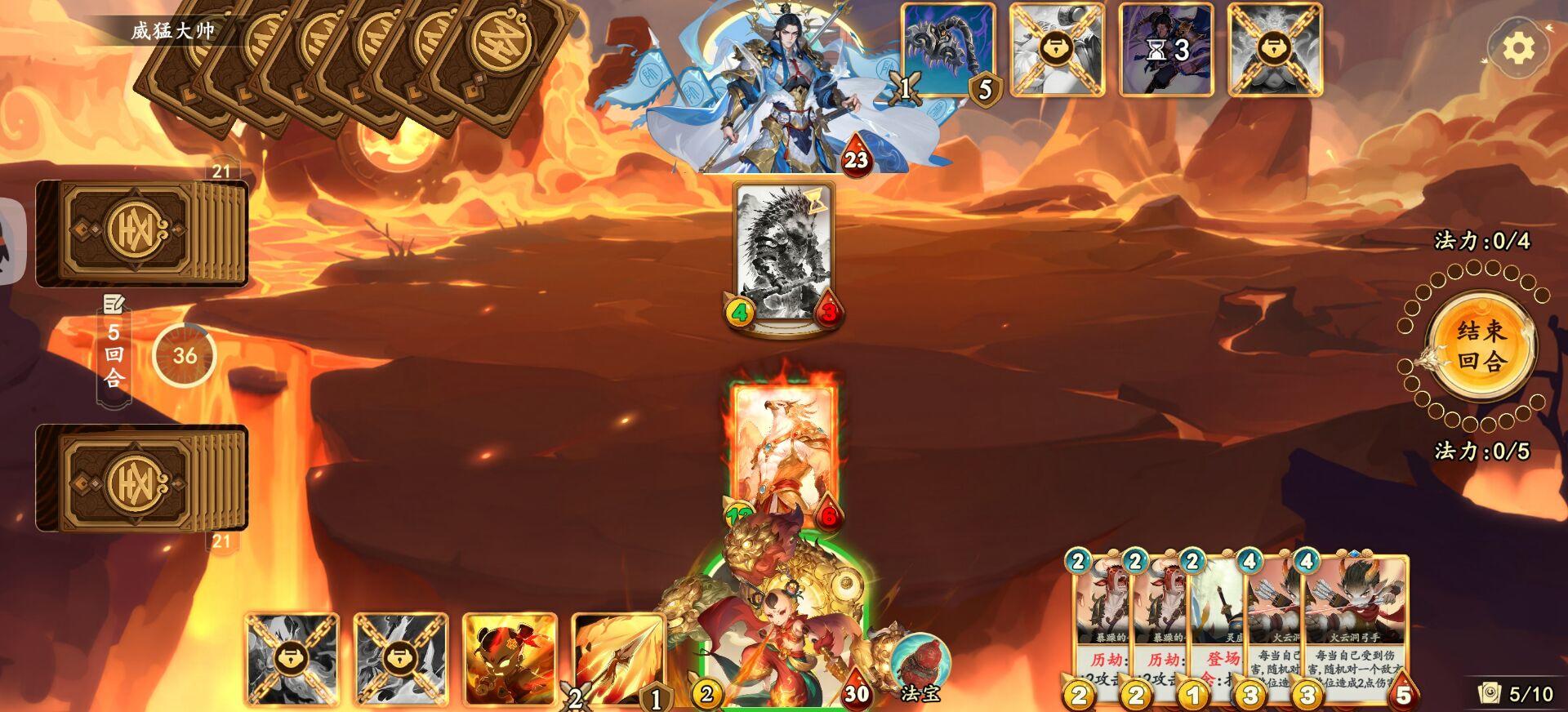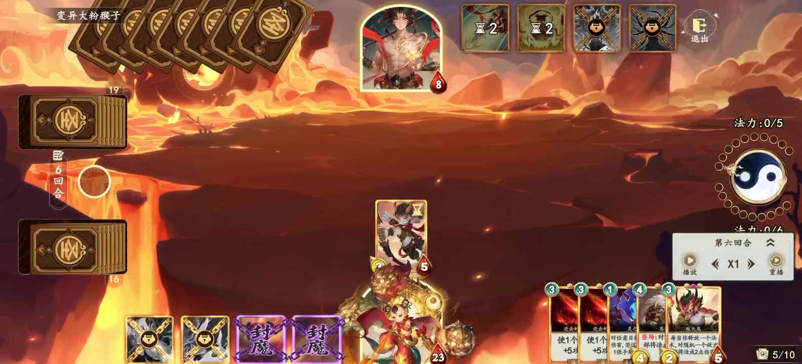 来自游戏ID : 4128585613312 介绍: 哪吒后手, 前期一直被压血。 在第六回合, 强势返场,吹响反攻号角, 拉平血量差距, 从23-8到13-16。 不出意外的话, 下回合,哪吒血量将到至少24, 而红孩儿血量最多只能剩下5点。 可惜事与愿违, 没有解场, 以至于进入了红孩儿18血斩杀线, 最终惜败。