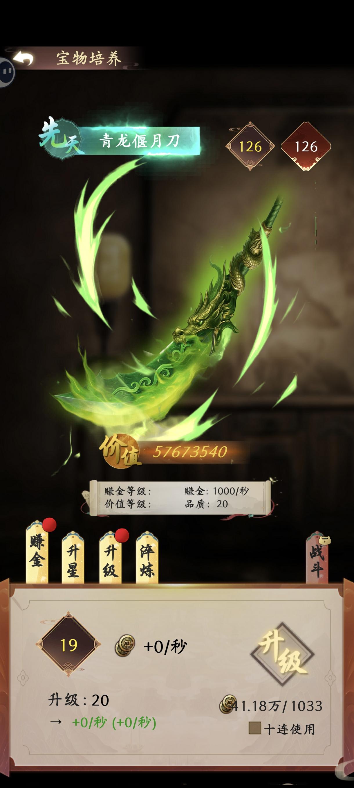本质上是个点击英雄类型的游戏,战力超过11.55万就可以通关了,只要舍得点,可以一直冒险打下去,剩下的就是开宝物升级了。。。