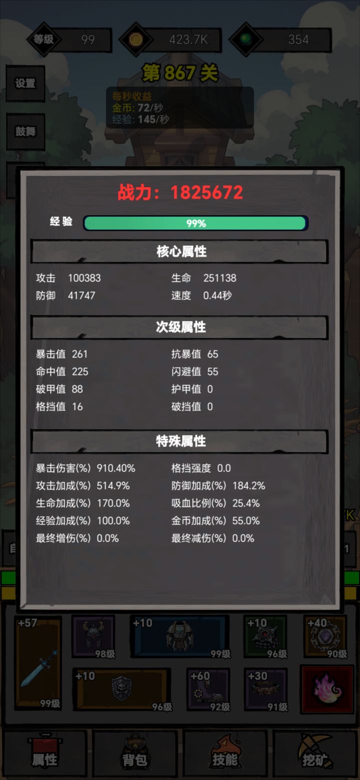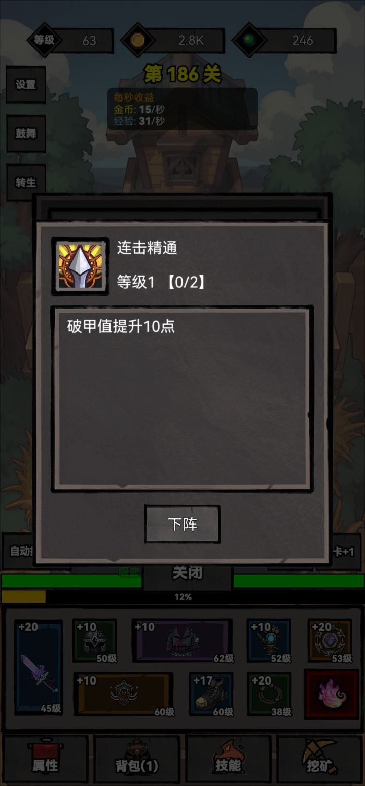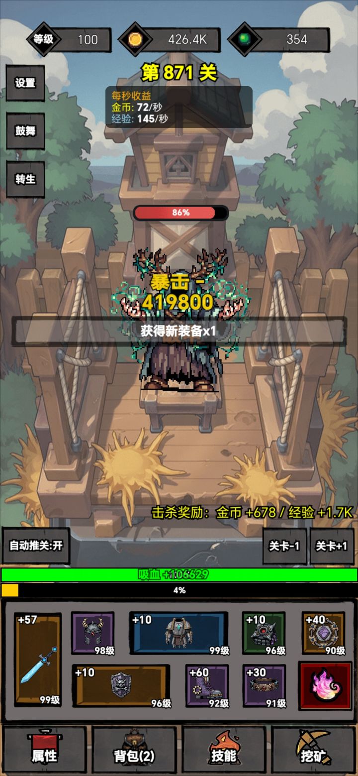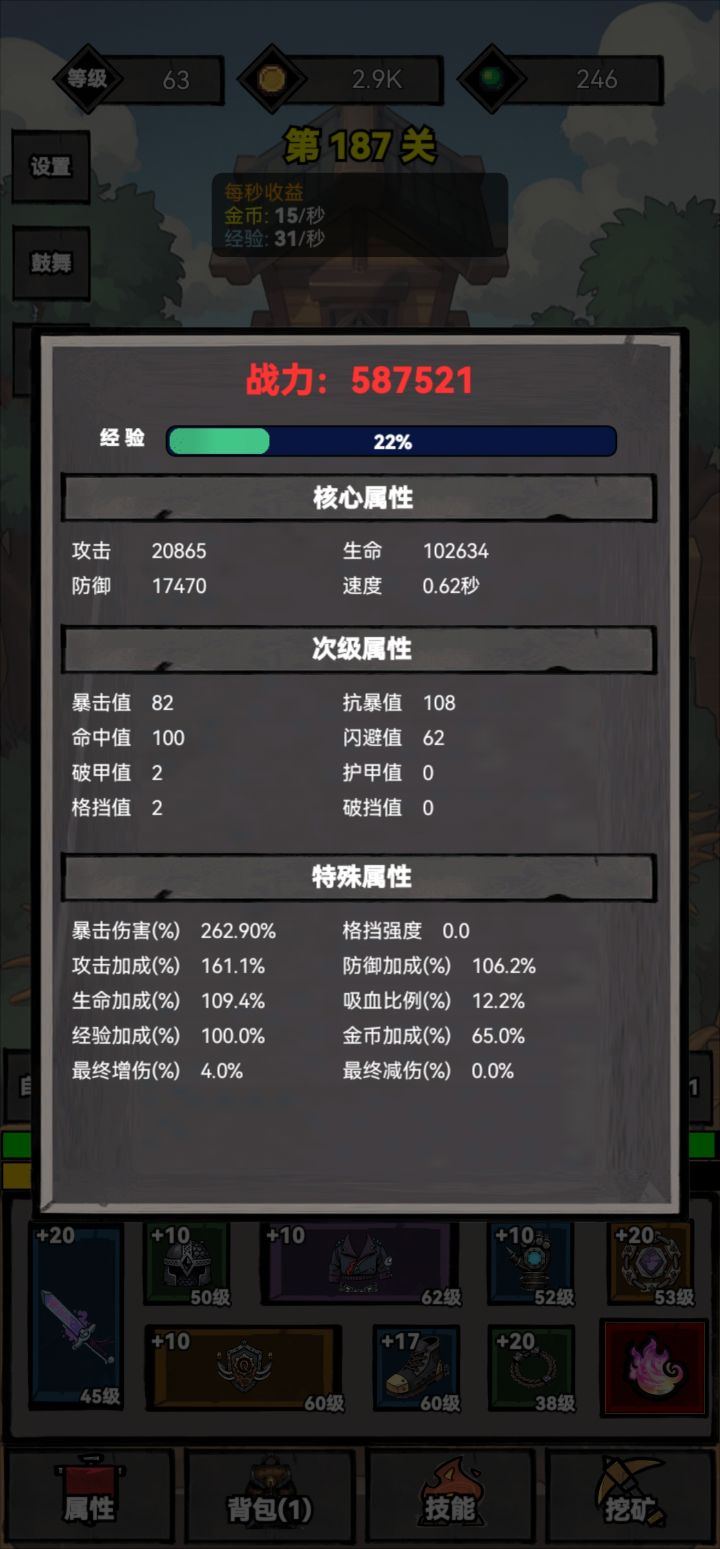 这游戏体系比较简单。分为1.经验升级对应的装备(基础战力)2.装备强化(基础副属性)3.转生魂火对应的天赋体系(增幅)4.挖坑获得技能(主要是吸血)开局主要过50关转生获得魂火开始增幅。增幅优先选择暴伤和攻击。在攻击与爆伤达到200%和350%的时候,点100%的经验值。注意每次转生都要挖矿看广告挖满,挖矿最好在层数较高的时候进行。装备强化优先命中,暴击,速度。以上足够新手过渡至熟悉游