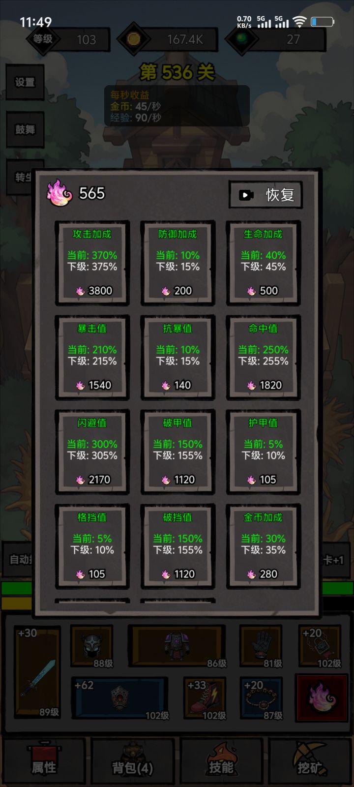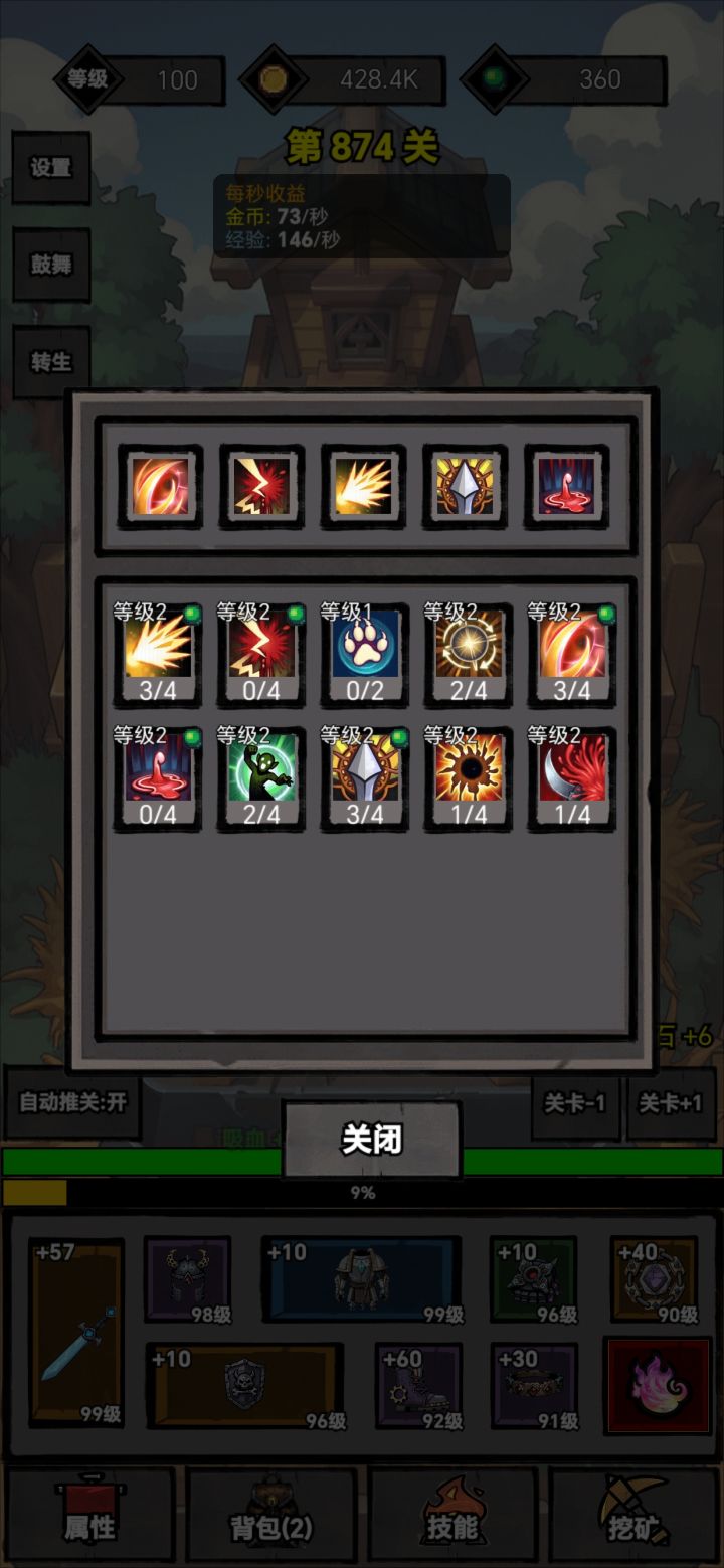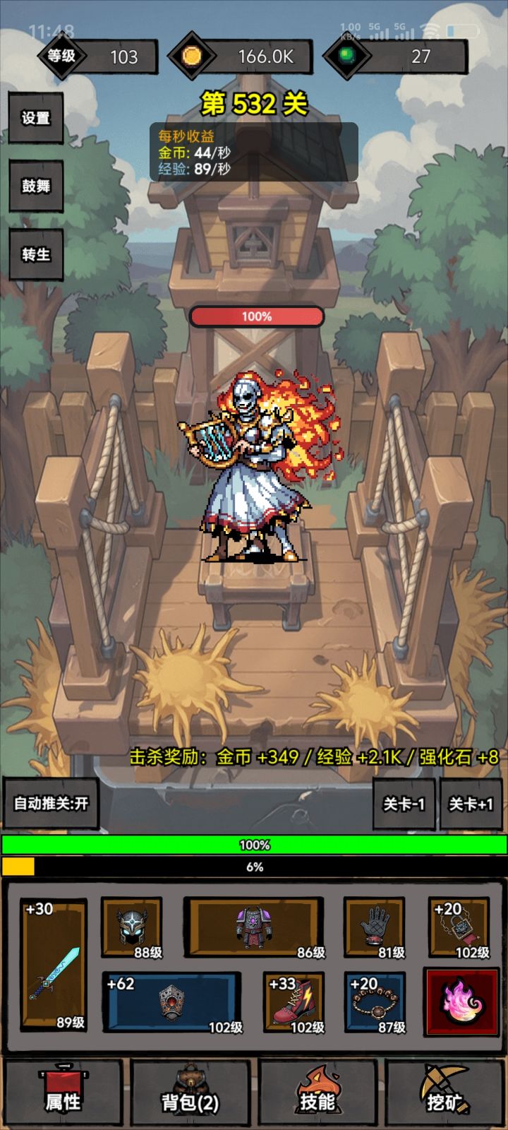 这游戏体系比较简单。分为1.经验升级对应的装备(基础战力)2.装备强化(基础副属性)3.转生魂火对应的天赋体系(增幅)4.挖坑获得技能(主要是吸血)开局主要过50关转生获得魂火开始增幅。增幅优先选择暴伤和攻击。在攻击与爆伤达到200%和350%的时候,点100%的经验值。注意每次转生都要挖矿看广告挖满,挖矿最好在层数较高的时候进行。装备强化优先命中,暴击,速度。以上足够新手过渡至熟悉游