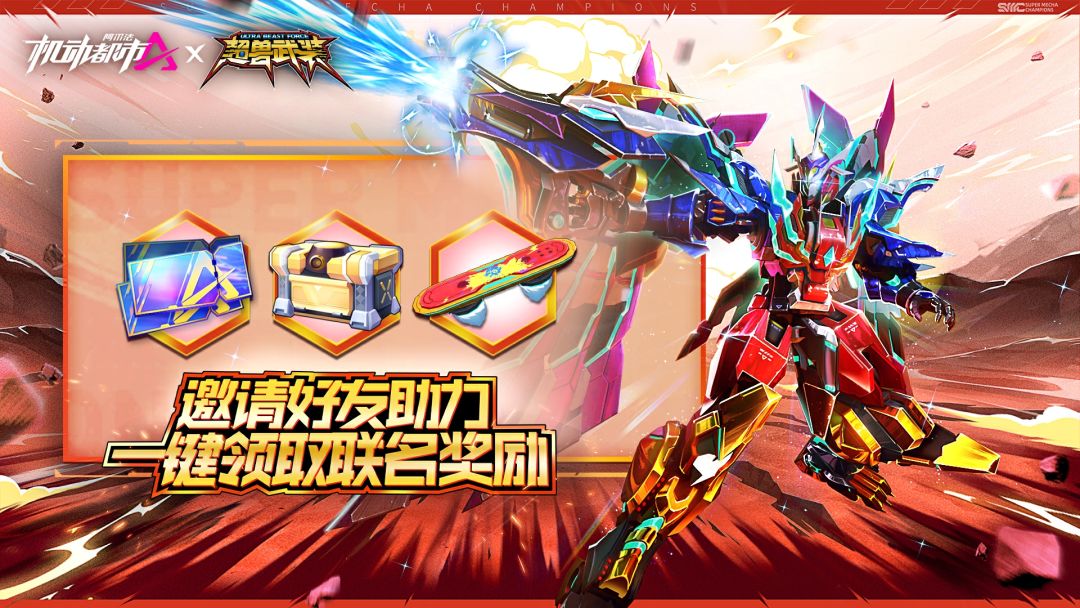 《超兽武装》联动火热来袭,邀请好友助力,领取多重好礼! 11月30日~12月28日起: 在游戏大厅点击活动-限时-超兽武装联动好礼-点击参与,自动跳转至活动页面; 或点击链接前往活动页面, 邀请好友绑定账号并助力,即可领取典藏礼券、能源、炫彩幸运礼券等奖励!邀请5位好友助力,还可获得《超兽武装》联名滑板外观*1! 快来邀请你的朋友们,共同赢取限定好礼吧!