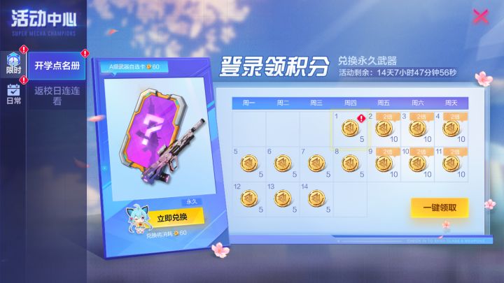 亲爱的选手们:为了给选手们带来更好的参赛体验,我们将于9月1日上午11:00左右进行不停机维护,维护期间充值和匹配功能会暂停使用。维护完成后,需退出游戏下载更新补丁,才可体验最新的游戏内容。【全新活动上线】1. “开学点名册”活动登录领积分,即可兑换永久武器外观!2. “返校日连连看”活动完成对局任务,完成连线,即可获得多样好礼!【平衡性调整】1.北境骑士提升主武器主弹对机甲伤害