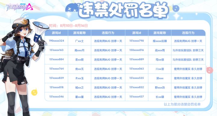 各位选手好:《机动都市阿尔法》官方团队致力于为大家提供一个健康、公平的游戏环境,坚决贯彻对外挂“零容忍”的态度,一经发现必将严惩!在运营过程中,我们将会在游戏中进行7*24全天实时监测,对于任何利用外挂、第三方软件、非官方提供违规安装包、游戏漏洞等非法手段,破坏游戏正常秩序的行为,经核实查处后,我们会根据违规行为给予永久封禁等严厉措施处罚并进行公示。现将8月10日-8月16日的部分违禁处罚名