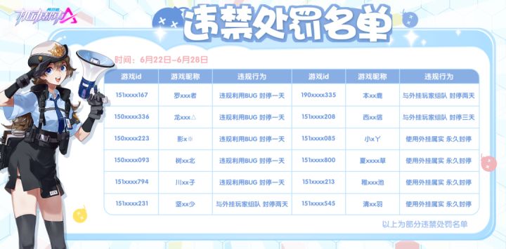 各位选手好:《机动都市阿尔法》官方团队致力于为大家提供一个健康、公平的游戏环境,坚决贯彻对外挂“零容忍”的态度,一经发现必将严惩!在运营过程中,我们将会在游戏中进行7*24全天实时监测,对于任何利用外挂、第三方软件、非官方提供违规安装包、游戏漏洞等非法手段,破坏游戏正常秩序的行为,经核实查处后,我们会根据违规行为给予永久封禁等严厉措施处罚并进行公示。现将6月22日-6月28日的部分违禁处罚名