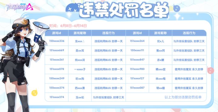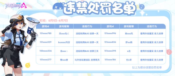 在运营过程中,我们将会在游戏中进行7*24全天实时监测,对于任何利用外挂、第三方软件、非官方提供违规安装包、游戏漏洞等非法手段,破坏游戏正常秩序的行为,经核实查处后,我们会根据违规行为给予永久封禁等严厉措施处罚并进行公示。