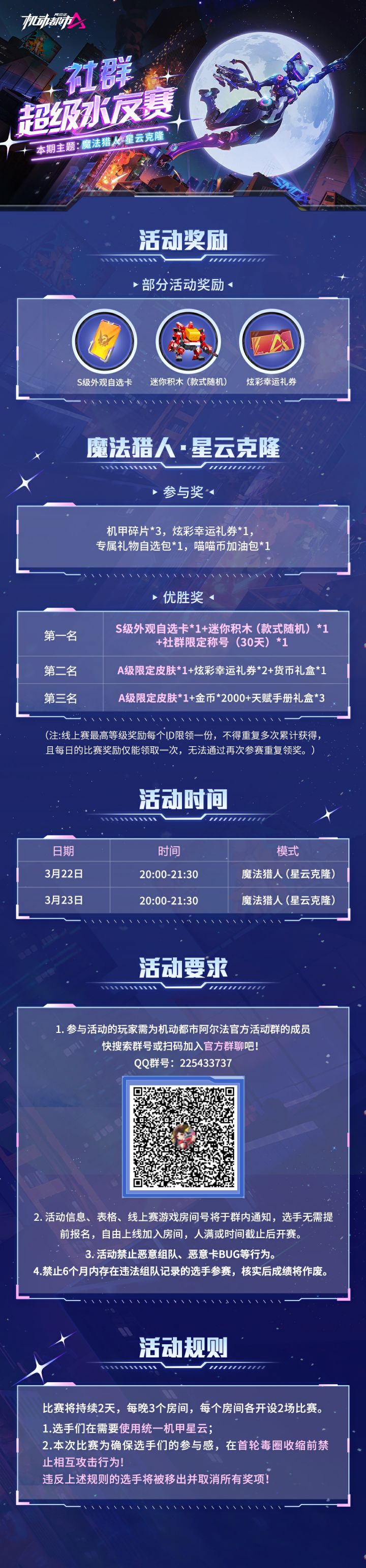 夜幕降临,狩猎开启,将星辰装入弹匣,用机甲星云一决胜负吧!本期水友赛主题为:魔法猎人-星云克隆!在魔法猎人模式中,决出谁是最强星云使用者吧!加入官方社群,参加水友赛,S级皮肤自选卡、迷你积木周边、炫彩幸运礼券等你拿!详情请戳长图了解~*注:本次水友赛为周五、周六晚开赛,选手们不要错过时间哦~