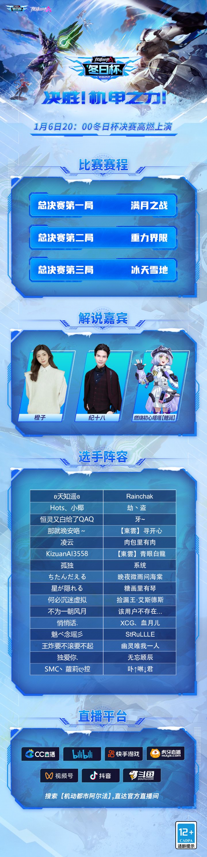 机动都市冬日杯决赛即将开启,32位精英选手已就位,最终之战一触即发!本次更特邀【燃烧初心塔塔】助阵解说,不仅有高燃对决,更有精彩对局分析,绝对不容错过!今晚20:00,b站、虎牙、快手、CC直播、微信视频号、抖音、斗鱼等平台现场直播,搜索【机动都市阿尔法】带你直击决赛现场!决胜!机甲之力!一起见证夺冠时刻吧!