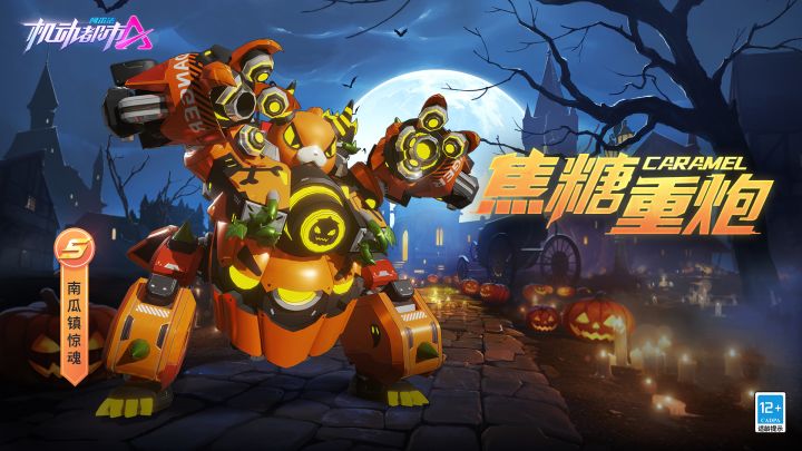 黑夜降临,南瓜镇阴森森月光幽蓝,小恶魔来敲门举起掌心炮,不给糖就捣蛋!奇妙惊魂夜,糖果都拿来焦糖重炮S级外观【南瓜镇惊魂】将于10月13日上线机动都市!