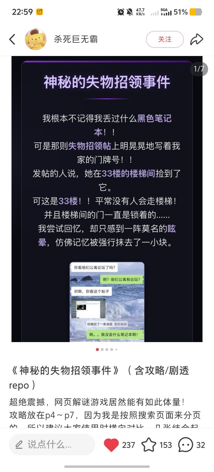 提示跟没讲一样。手套帖子找到老赵两口子9年前出过事,然后啥也找不到了。返回键是要我搜索什么?apartment forum?有看没有懂耳机丢失贴,找到个王大妈,找到个暴躁的幽灵,没了一开始用手机,后面又用电脑玩。电脑平台是比手机更适配,但游戏玩不明白啊