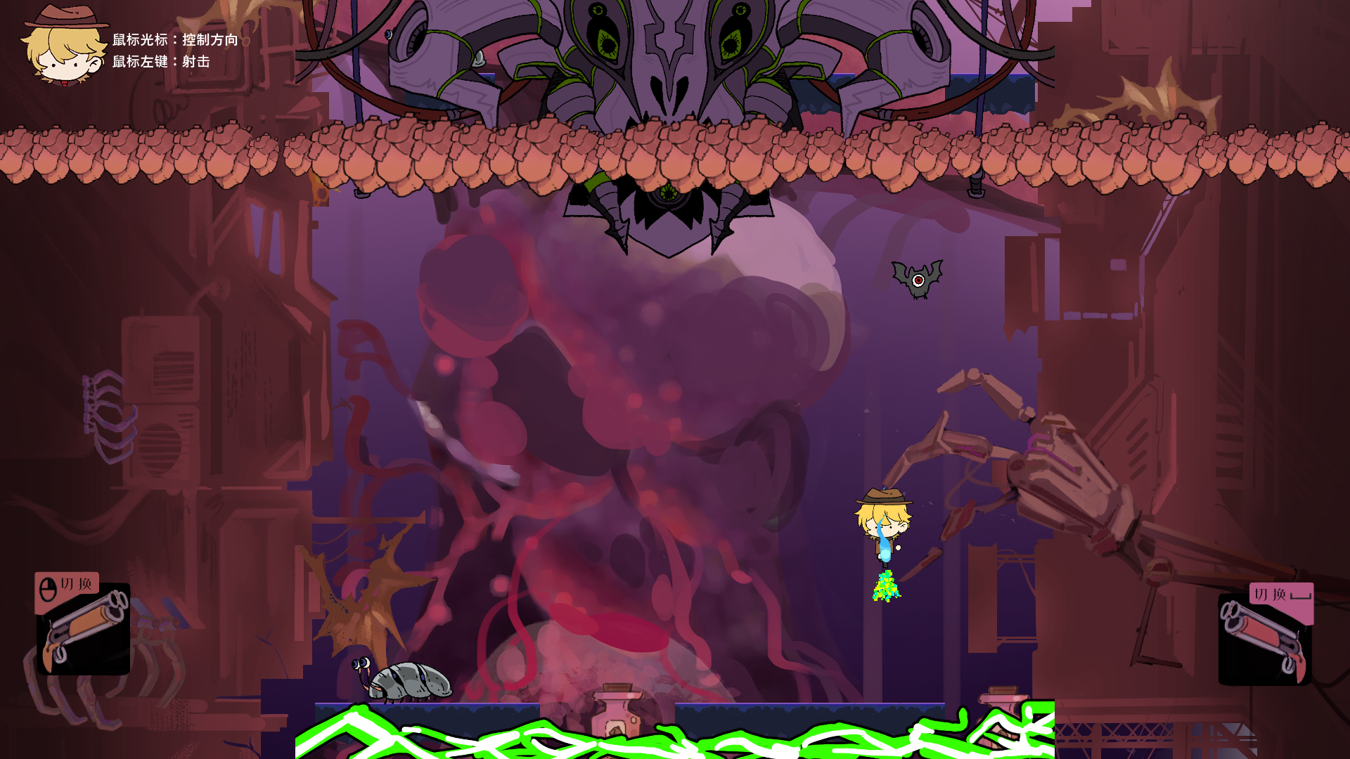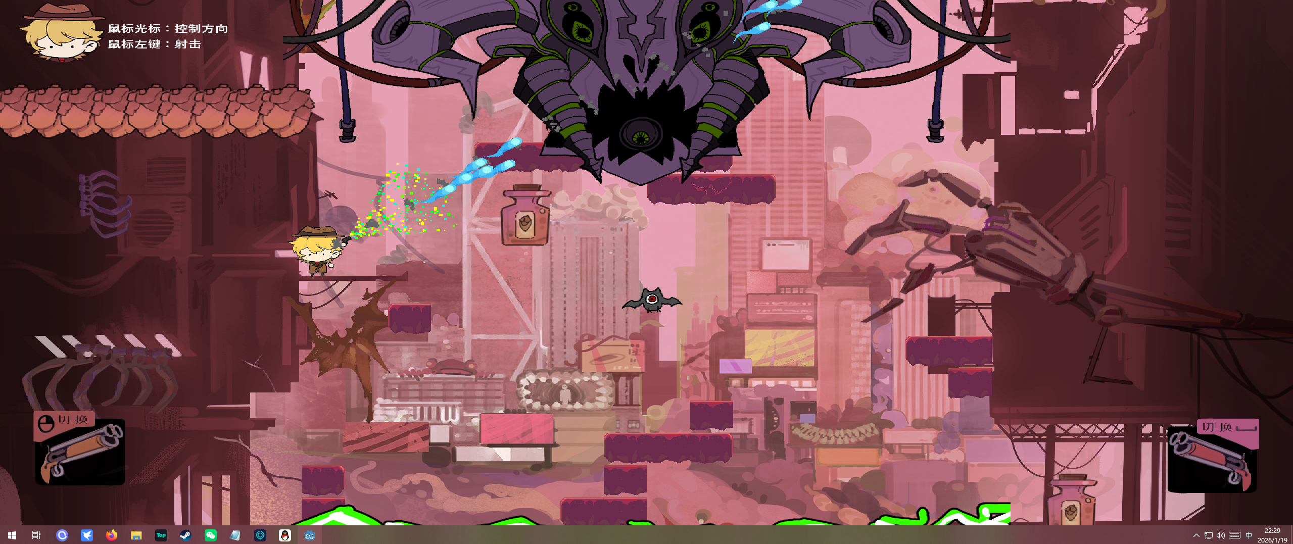 游戏的玩法是小人会从高空一直往下掉落,通过鼠标或者键盘进行射击,惯性会导致人物在不同方向的移动,使用不同的武器会有不一样的移动效果。在下落过程中,需要躲避怪物和射线,当然也可以直接用子弹射击怪物。有一些瓶子一样的东西可以加生命。到中期会有boss攻击我们,底部也会有绿色的激光,这个时候下落得太慢或者太快都会收到伤害。