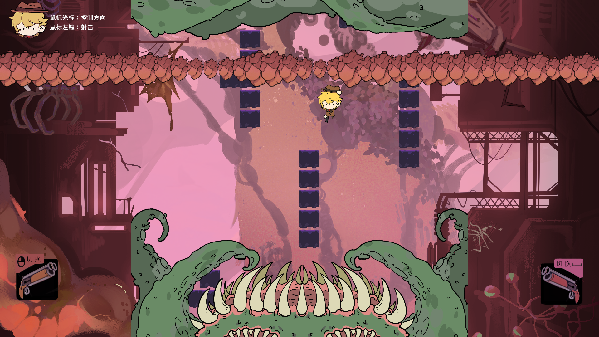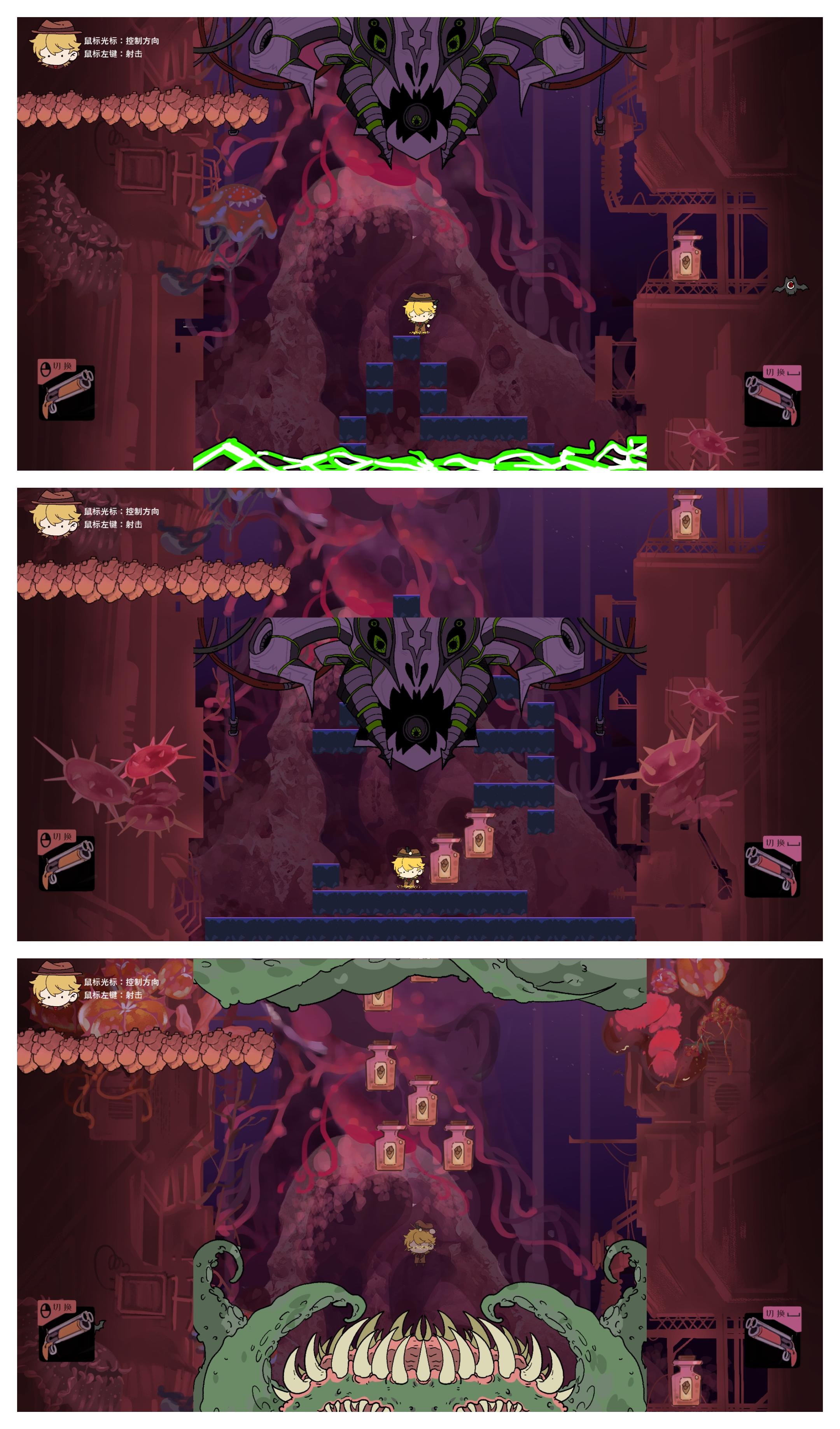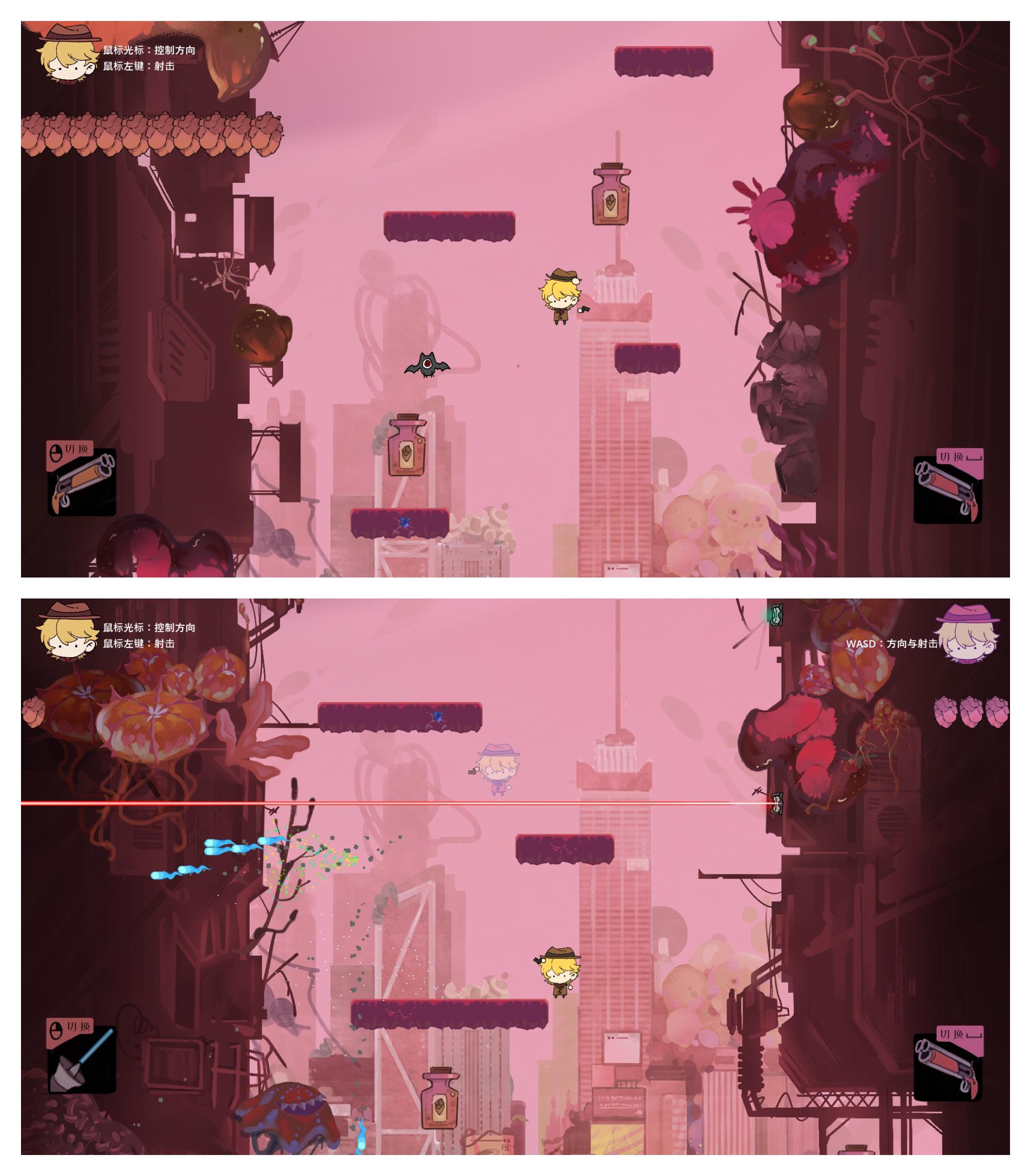 比较让我惊讶的是,游戏还有双人模式,本地双人的形式,两套不同的操作模式,为这个游戏增加了可玩性,需要考虑另一个玩家的速度,也可以挑战自己一个人体验手忙脚乱。游戏的手感很好,操作也很容易熟悉,熟悉过后会觉得玩起来很爽。玩法比较经典成熟吧,我印象里遇到过这样类似的作品,所以没有感受到特别新的东西。游戏的主题和玩法感觉不是那么贴切,场景也缺乏故事性,如果能够给故事增加一些故事性,通过怪物和场景暗示情节和故事进展,增加主角人设,和更多不同效果的道具,也许会更好玩。结合深渊等内容,可以增加一些精神值方面的东西,切换不同效果的世界,每个世界有不一样的规则。这样可以增加一些与其他同等类型游戏的差异,做出点属于自己的特色,也符合了它的主题。