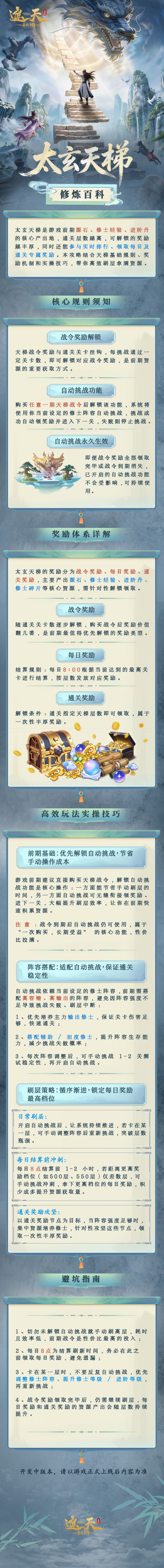道友们好,这期是全新栏目修炼百科!本栏目旨在为道友们介绍游戏的各种玩法,助力道友们更快地掌握自己的修行节奏!太玄天梯,是太玄门拙峰的标志性试炼之地,由九色古玉砌成,一阶一重天,越往上威压越强,不仅考验修士的肉身根基,更磨砺道心与悟性。本期首先带来的是太玄天梯玩法,道友们一起来看看吧~——————————全平台预约现已开启↑↑↑点击上方预约游戏,海量好礼等你来拿