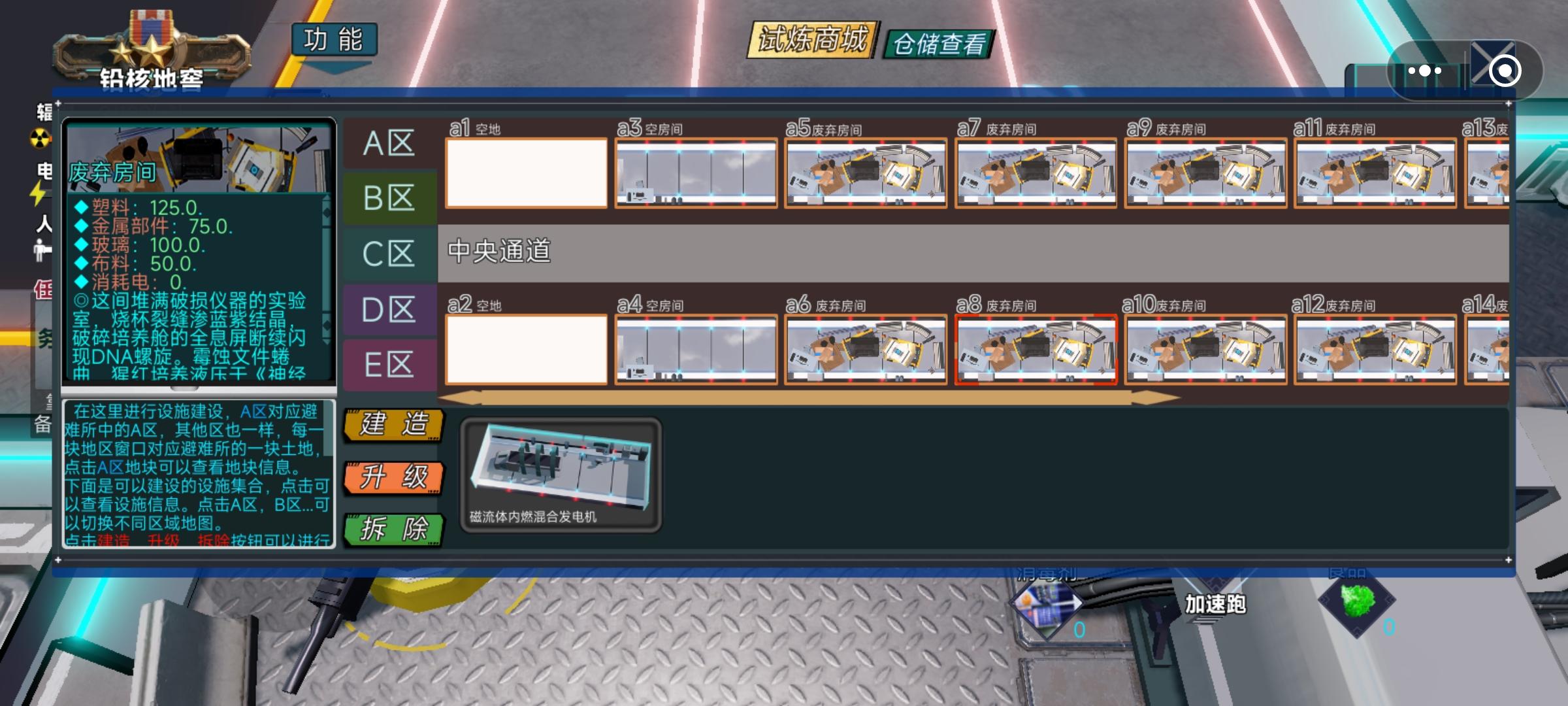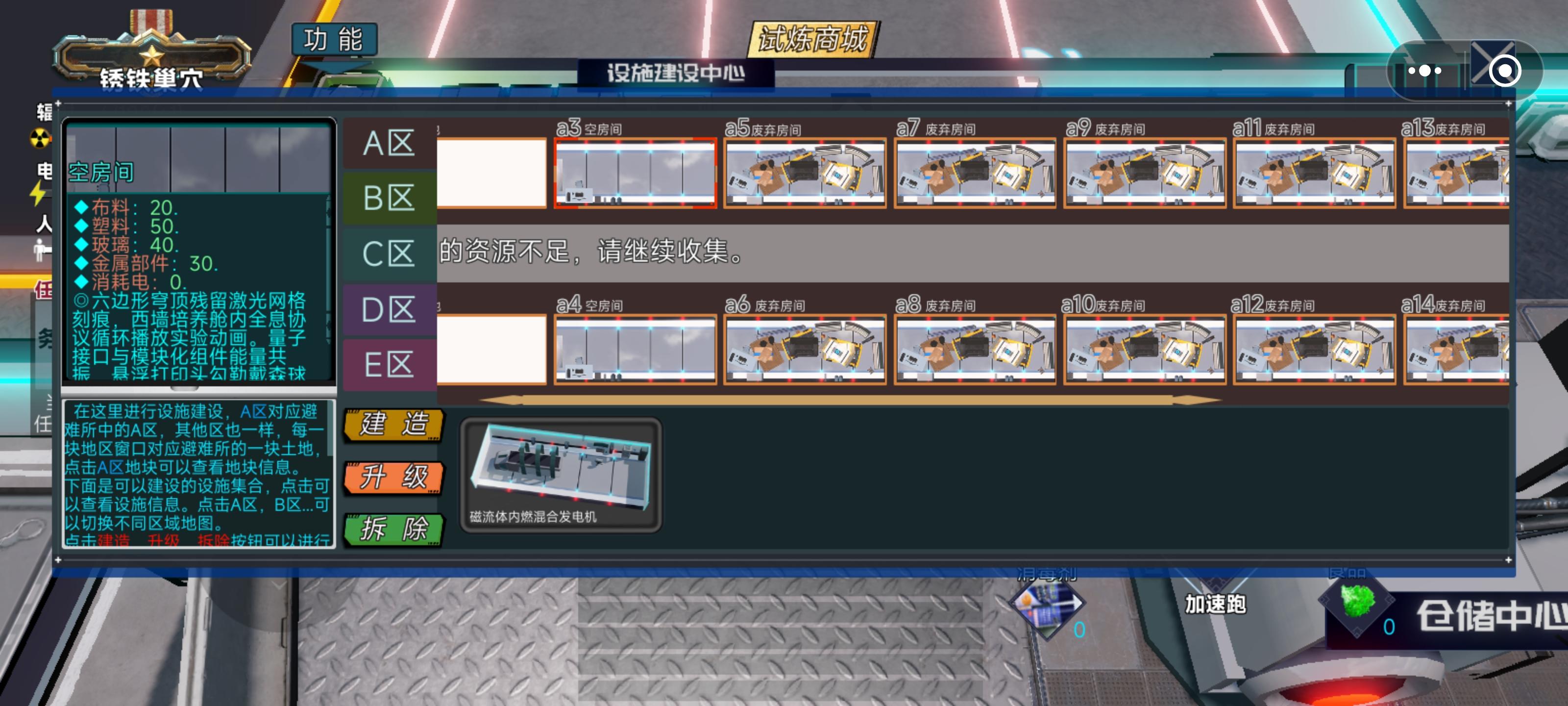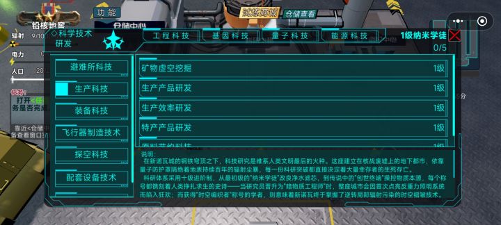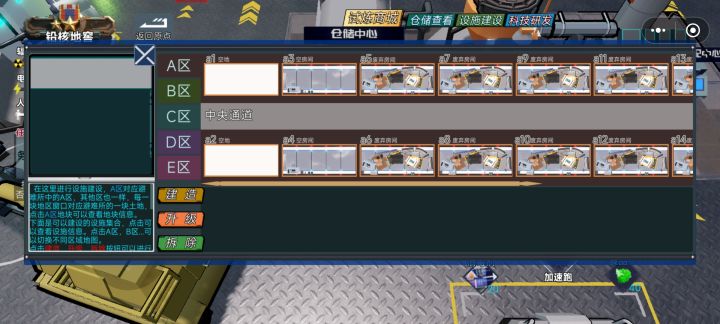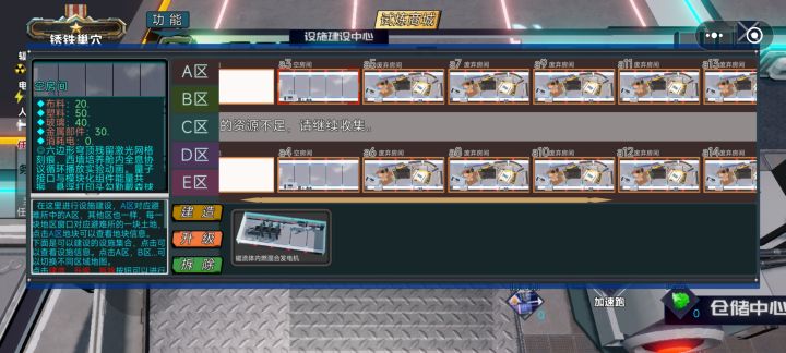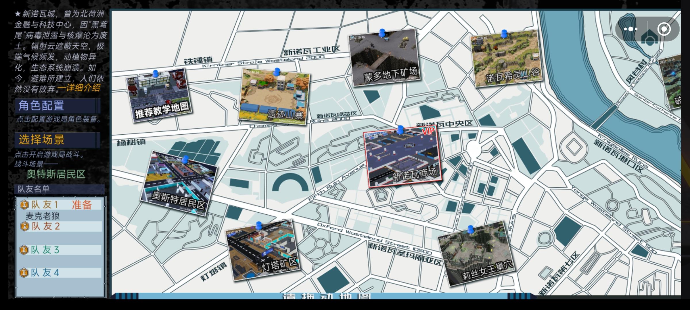 ◆1.我们首先进入大厅,可以看到2个房间选择,◈避难所经营<单人>◈这个房间是主要用来对避难所进行经营活动,◈探索诺瓦城<多人>◈则可以对诺瓦城进行探索,搜集资源打击丧尸然后撤回避难所进行经营。◆2.房间列表里有已经创建的房间的列表可供选择,其他的功能目前尚未进行填充,我们直接游戏就好。◆3.我们点击◈避难所经营<单人>◈进入避难所经营模式开始单人游戏,开头有个剧情过场可以点击跳过,略等,我们