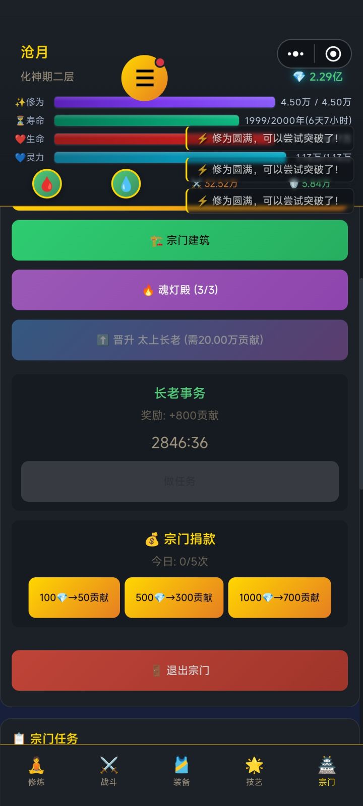 建议丹药出个一键炼制,宗门弟子自动刷的功能,道侣功能建议出个自动扣除寿命去召唤,而不是点完消耗60年后还要点一个查看,有点多余,毕竟都是合成材料,没有看的必要