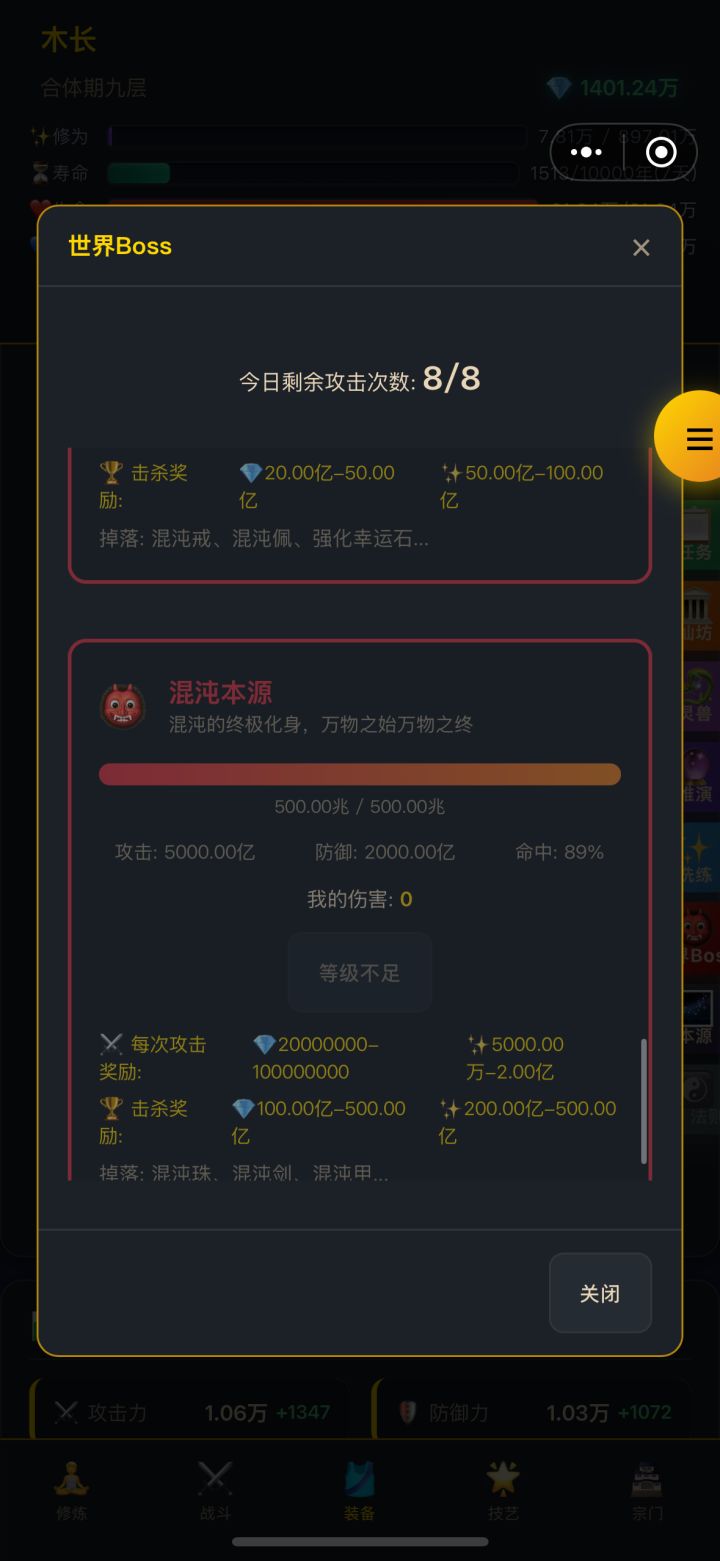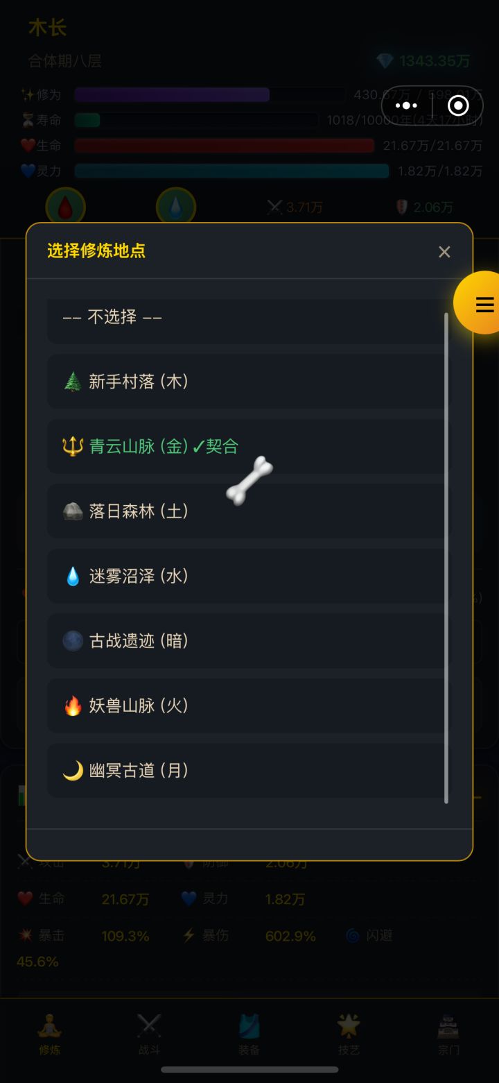 续写上一期6.机缘选择只选恶 就是最坏的词条 当恶值到达一定数量 会变成‹魔尊›可以获得20%攻击加成 10%暴击 和5%吸血(机选选择就是时不时会跳出选择题 让你选择 增加正义值和邪恶值的东西 )(到达魔尊后 可以进设置把机缘关掉 以防不需要点到正义值 把魔尊效果弄没 弄没也没事 后面去本源商店买去除正义值的丹药即可)7.宗门选择·开局直接进剑宗·然后有钻后 可以把下面的弟子抽出来