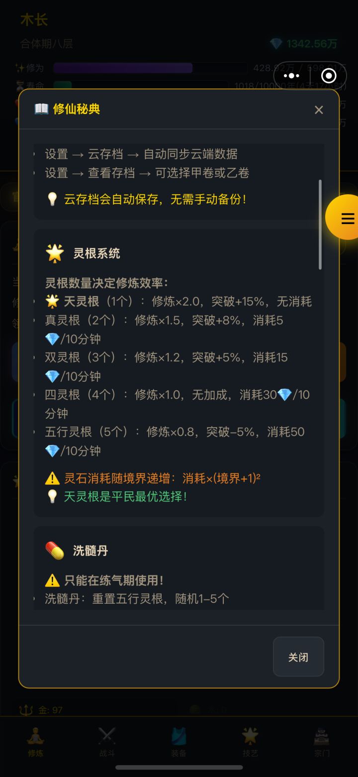 根据本人反复删除存档重开及交流群道友技巧综合,这是本人第一次写攻略,如有不当之处欢迎各位道友指出,希望各位道友多多包涵1.灵根 开局选灵根 重随出金天灵根(金单属性灵根且大于90)再开局,金天灵根加百分比攻击力,且修炼场所筑基期便开放2.修炼 闭关、战斗、秘境、试炼塔、吃培元丹都可以获取修为,前期闭关+战斗可以快速升级,中期试炼塔+磕丹,后期刷地图的boss和推塔3.功法 直接
