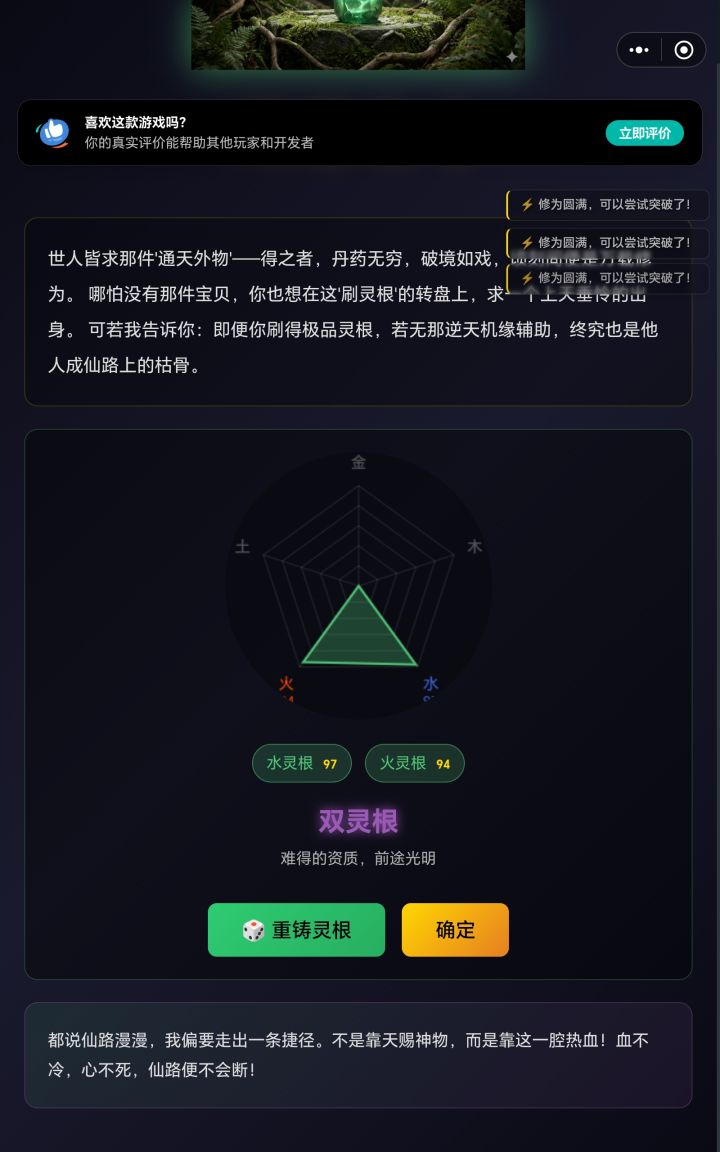 玩了不到一礼拜,深感这是一款非常精致有内涵的修真文字游戏,麻雀虽小,但是真就五脏俱全。1、游戏注重轮回理念,在轮回中不断夯实修真根基,每一世轮回都能提升 5%的基础属性,轮回点还能兑换永久轮回天赋点以额外提升属性和修炼速度,可以说每一世轮回后你都变强了,符合养成系手游的进化逻辑。击败前世轮回还能获取世界本源点,激活双采集位、进入体制殿全方位提升永久属性等。每一世轮回的历练,让我变得更强,这也是最