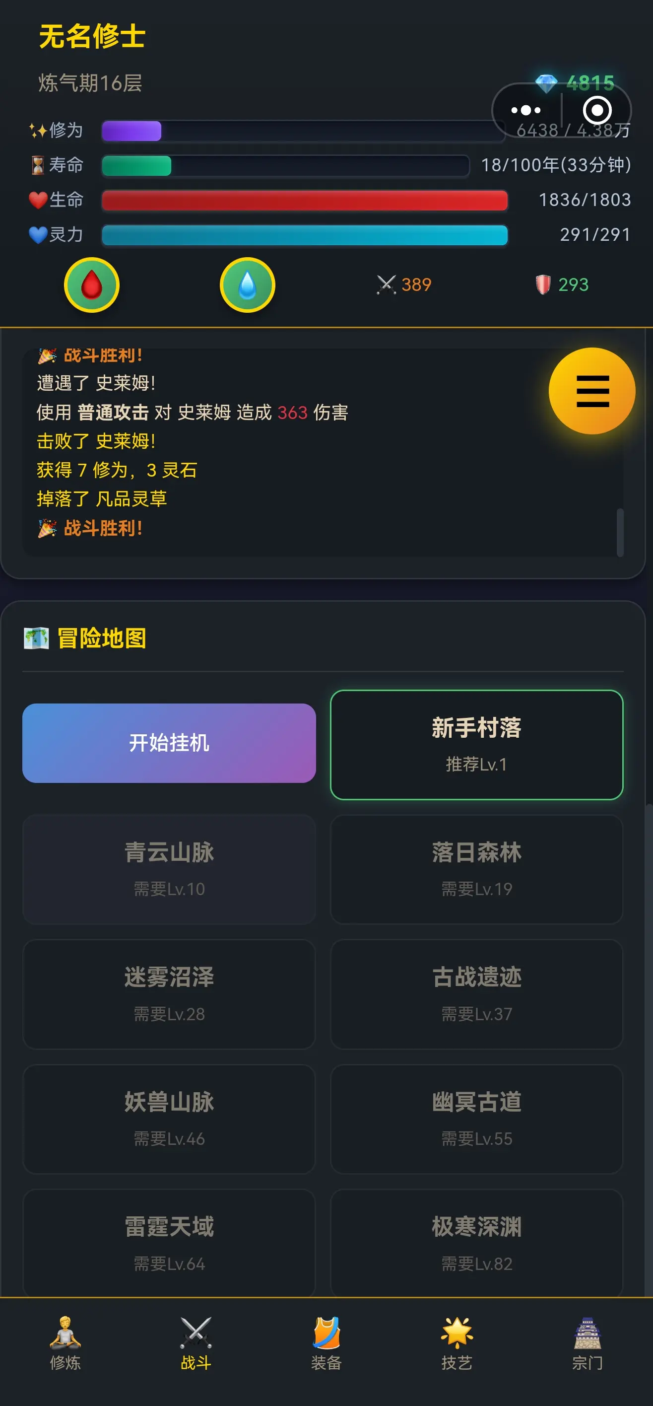 根据本人反复删除存档重开及交流群道友技巧综合,这是本人第一次写攻略,如有不当之处欢迎各位道友指出,希望各位道友多多包涵1.灵根 开局选灵根 重随出金天灵根(金单属性灵根且大于90)再开局,金天灵根加百分比攻击力,且修炼场所筑基期便开放2.修炼 闭关、战斗、秘境、试炼塔、吃培元丹都可以获取修为,前期闭关+战斗可以快速升级,中期试炼塔+磕丹,后期刷地图的boss和推塔3.功法 直接