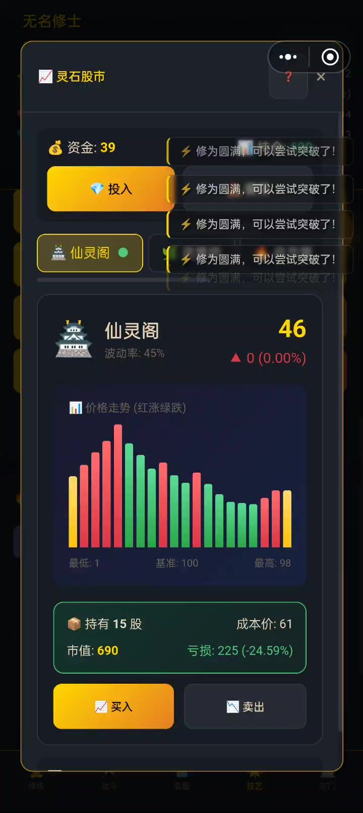 我错了,别跌了,呜呜[表情_泪目],都基准一半了怎么还在跌啊。 这个股票买的时候感觉不是很方便,不便于一键梭哈 ps:那个修为满了的提示弹窗能不关一下
