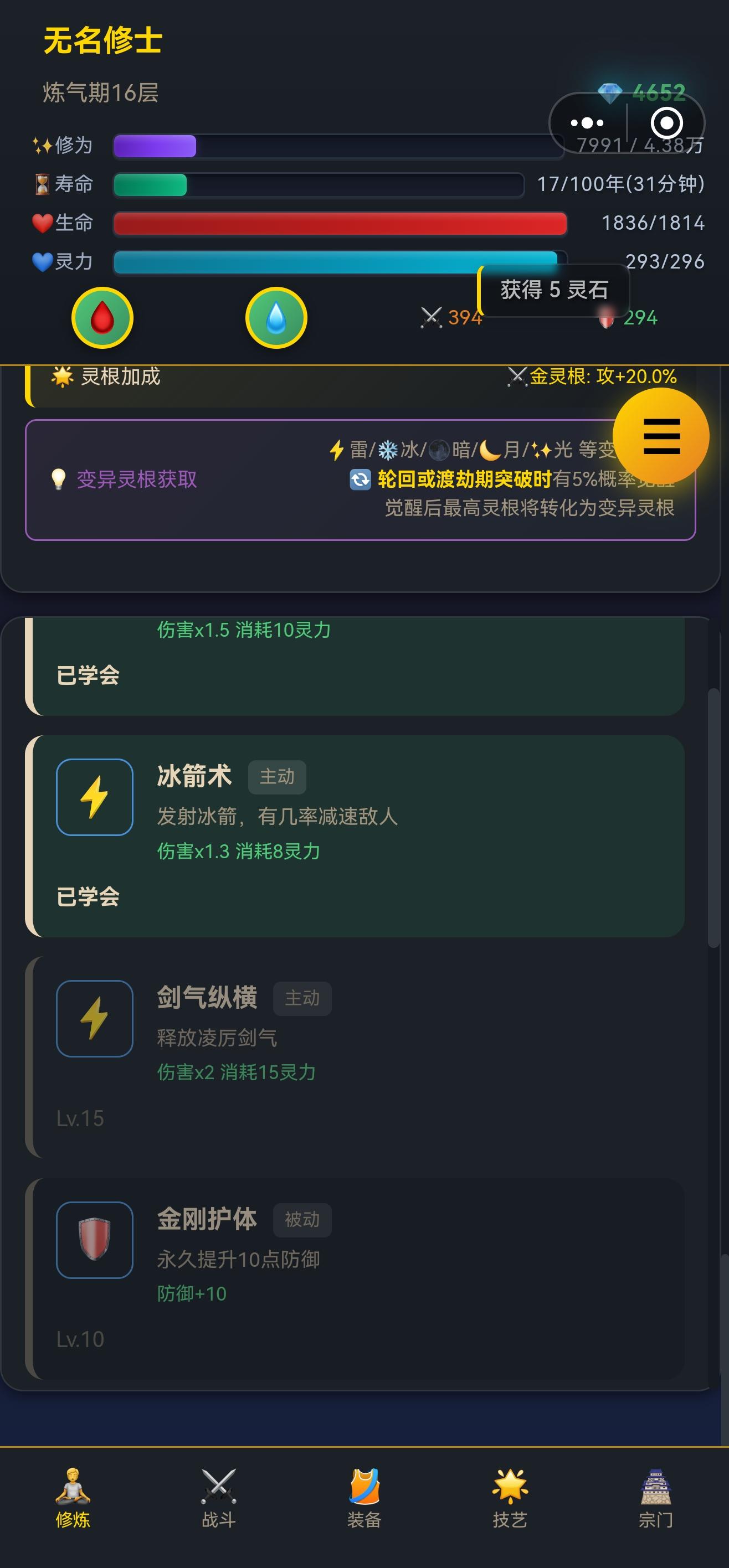 根据本人反复删除存档重开及交流群道友技巧综合,这是本人第一次写攻略,如有不当之处欢迎各位道友指出,希望各位道友多多包涵1.灵根 开局选灵根 重随出金天灵根(金单属性灵根且大于90)再开局,金天灵根加百分比攻击力,且修炼场所筑基期便开放2.修炼 闭关、战斗、秘境、试炼塔、吃培元丹都可以获取修为,前期闭关+战斗可以快速升级,中期试炼塔+磕丹,后期刷地图的boss和推塔3.功法 直接
