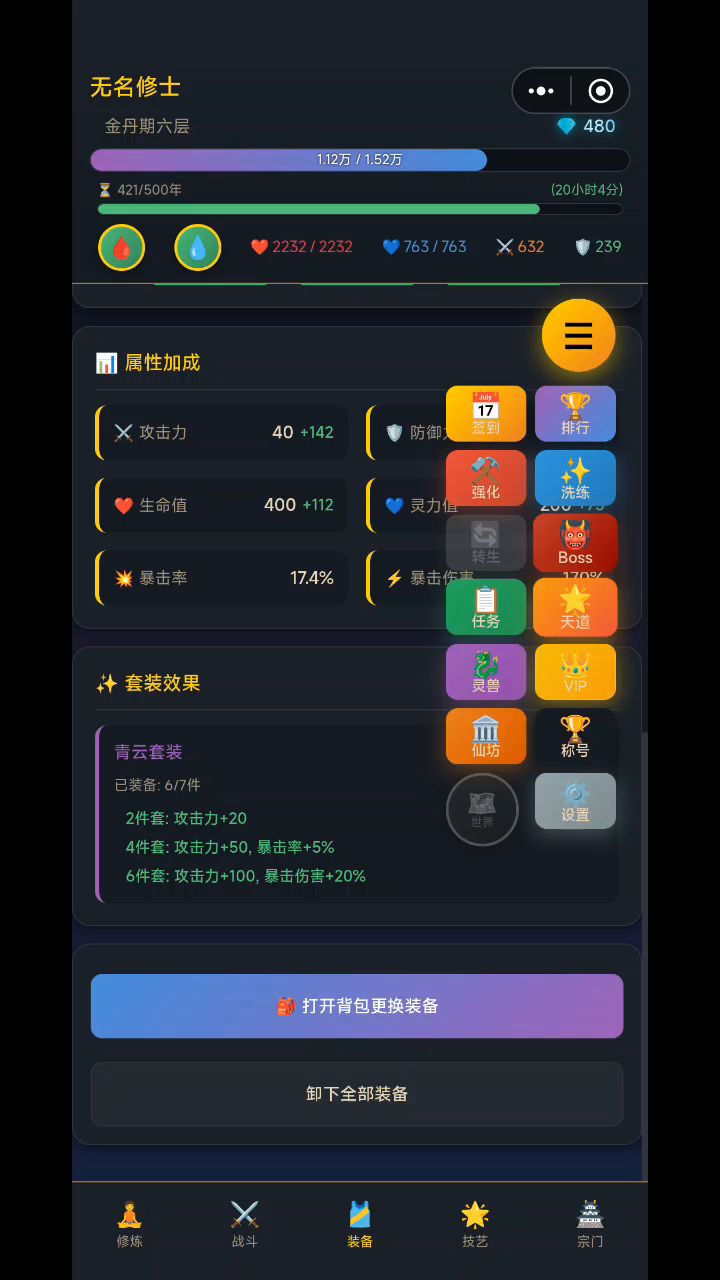根据本人反复删除存档重开及交流群道友技巧综合,这是本人第一次写攻略,如有不当之处欢迎各位道友指出,希望各位道友多多包涵1.灵根 开局选灵根 重随出金天灵根(金单属性灵根且大于90)再开局,金天灵根加百分比攻击力,且修炼场所筑基期便开放2.修炼 闭关、战斗、秘境、试炼塔、吃培元丹都可以获取修为,前期闭关+战斗可以快速升级,中期试炼塔+磕丹,后期刷地图的boss和推塔3.功法 直接