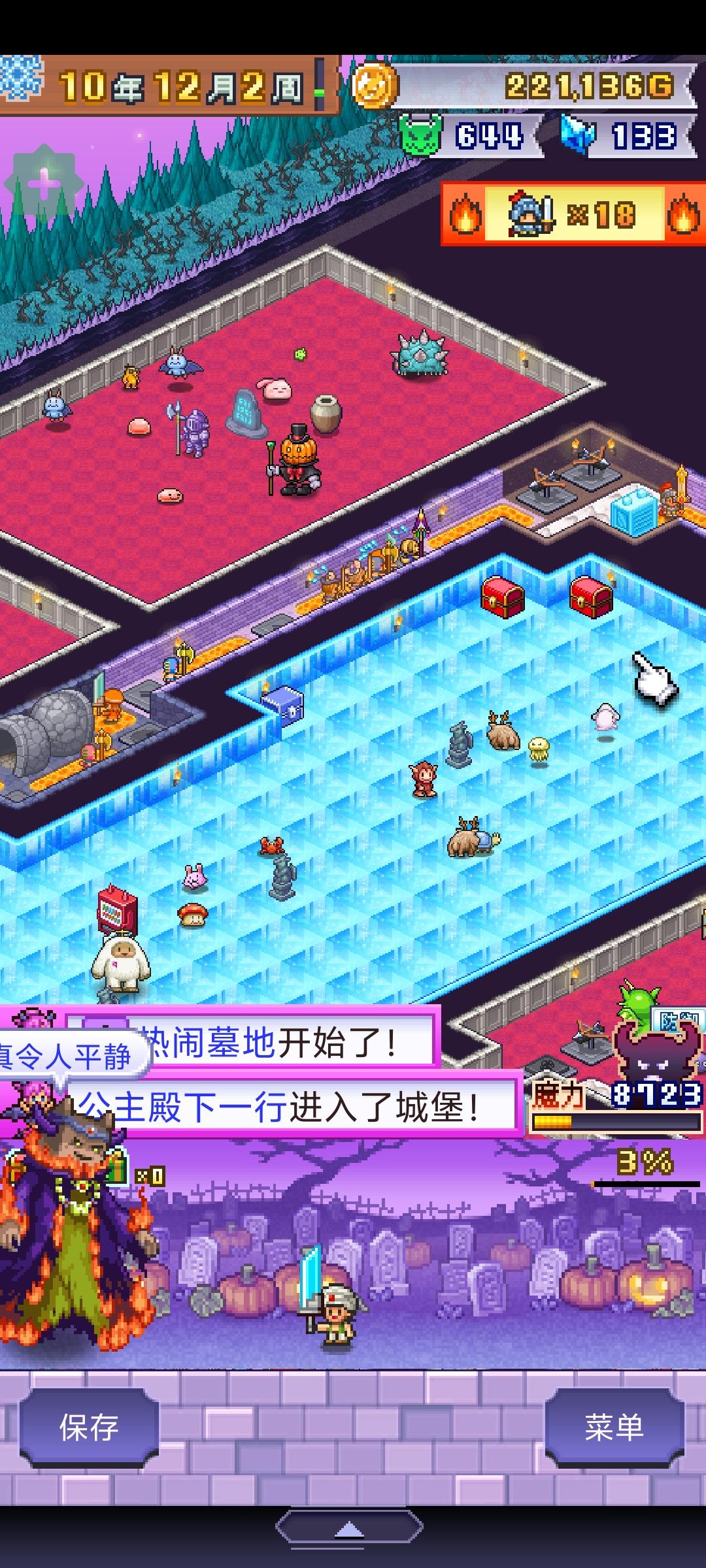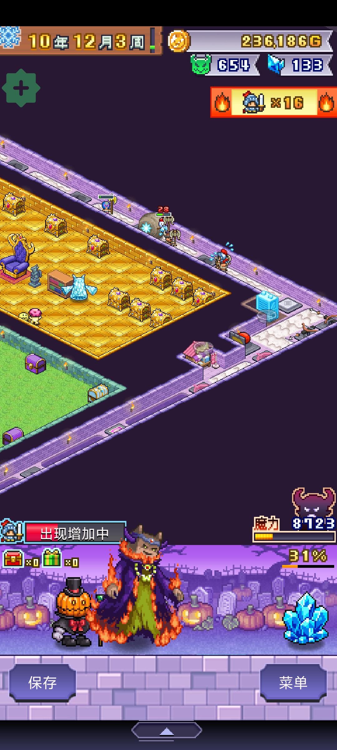 一款不需要动脑子但是挺累的打怪类开罗游戏,累在要不断继承重开档,因为每结算一次会多给一个开罗雕像+多继承一个新魔物。这是第二款能让我重开档的开罗游戏,第一款是初代赛车物语,当时是为了爆金光改造零件。因为我不玩陷阱流,所以布局最重要的就是多分房间、多造岔路。每个关键节点房间放一只大佬,虽然冒险者会乱走导致没法靠一只拦下所有,但每一个跟它对上眼的孩子都活不过一集,这就很好。虽然后期冒险者人数巨多,但